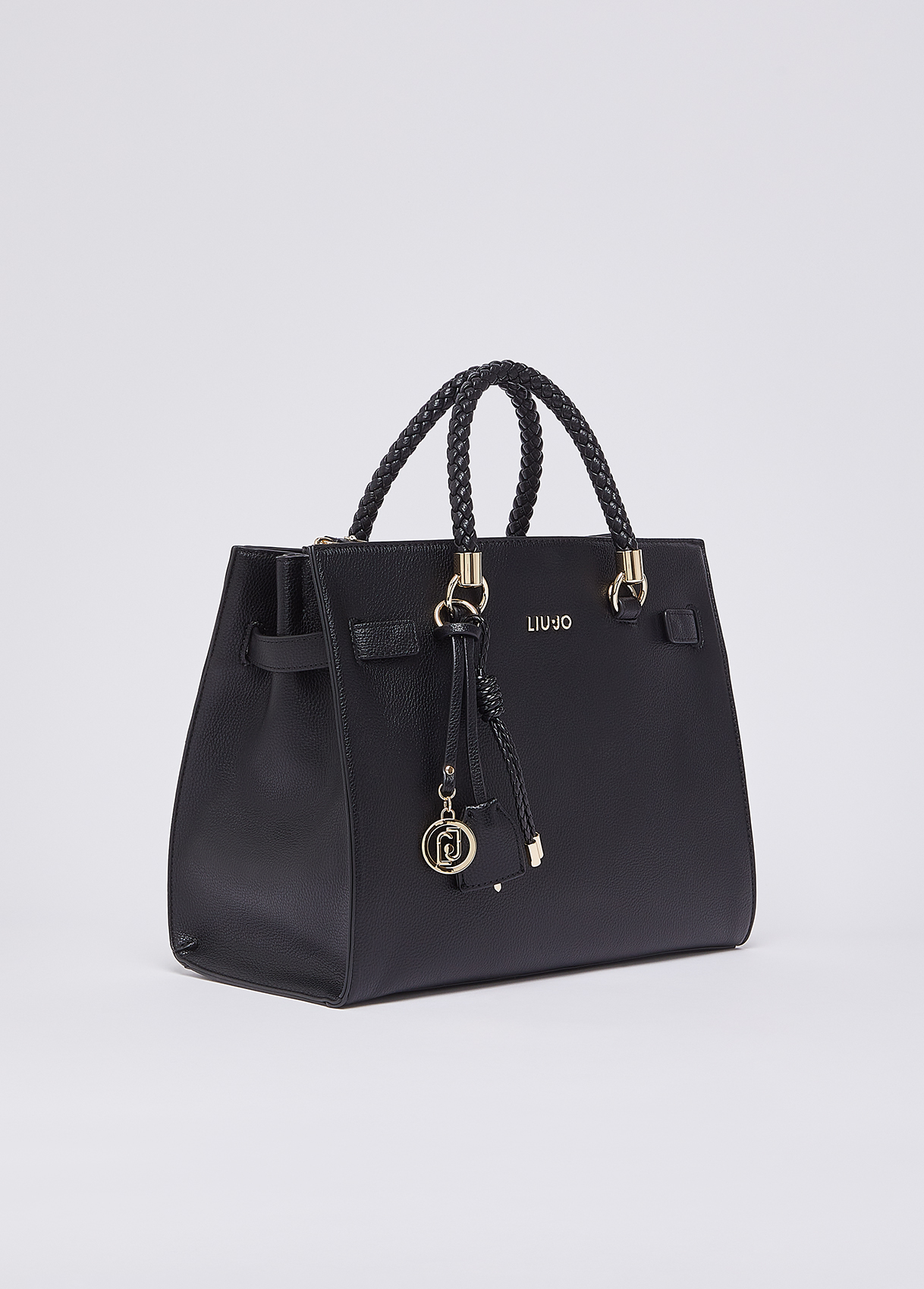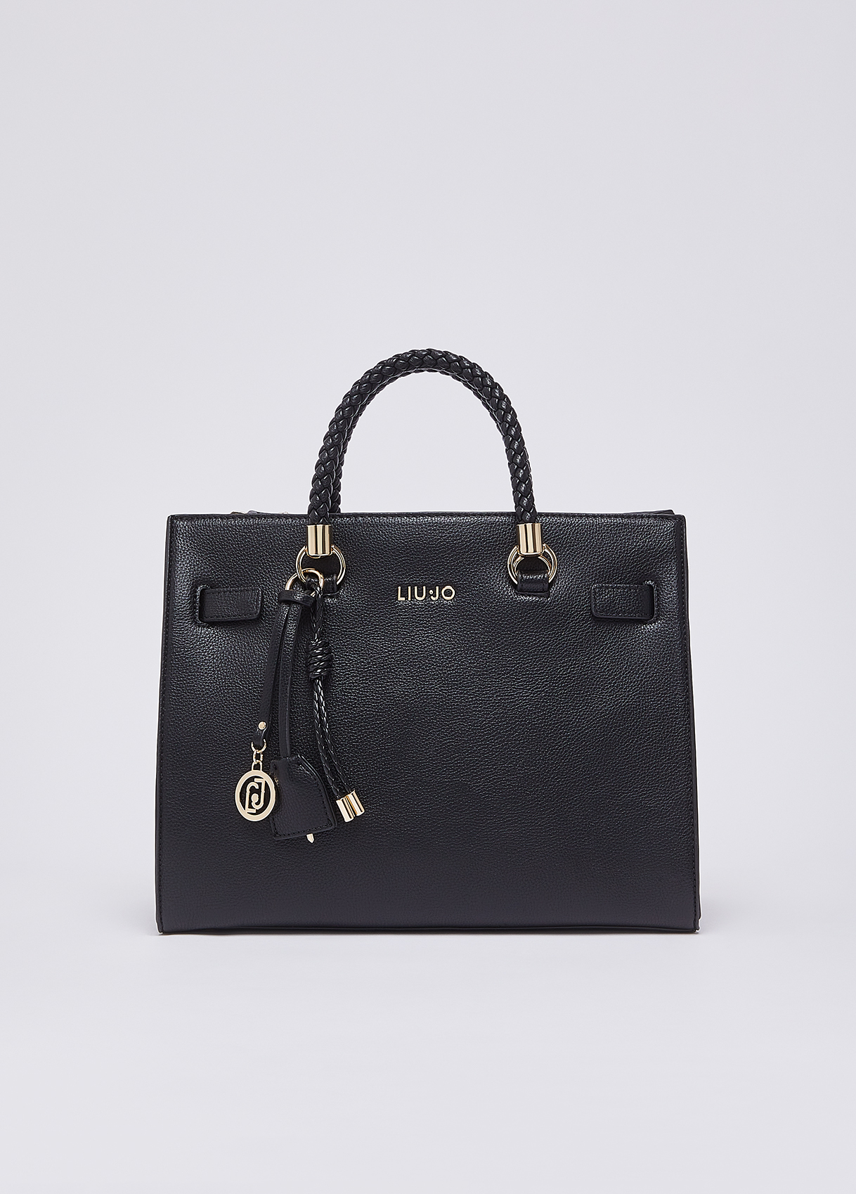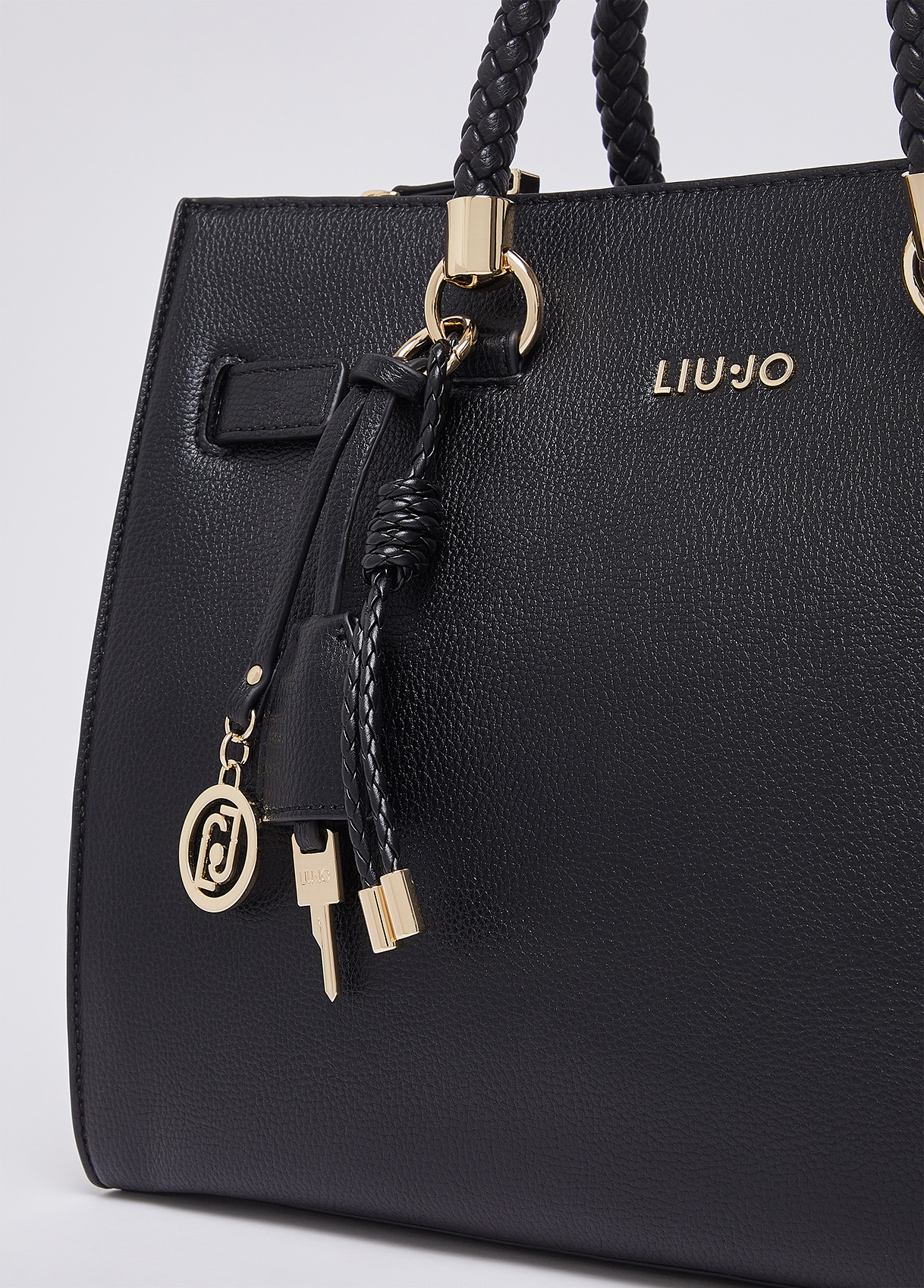 Measurements: 31 x 17 x 26 cm Medium black bag Satchel model Drummed effect Internal lining with logo Two zip-up compartments Central compartment closed with magnetic button Braided handles Matching colour charm Detachable shoulder strap Liu Jo Better product
