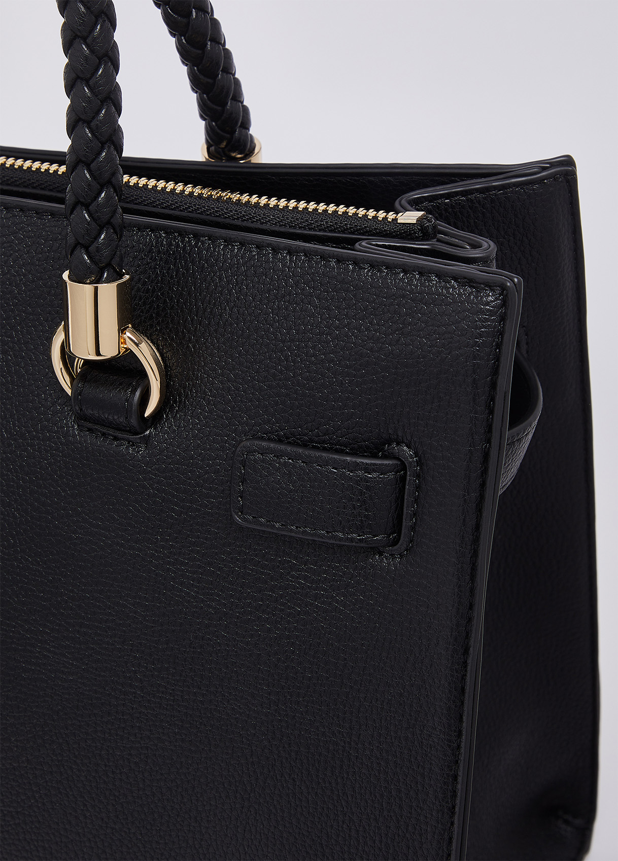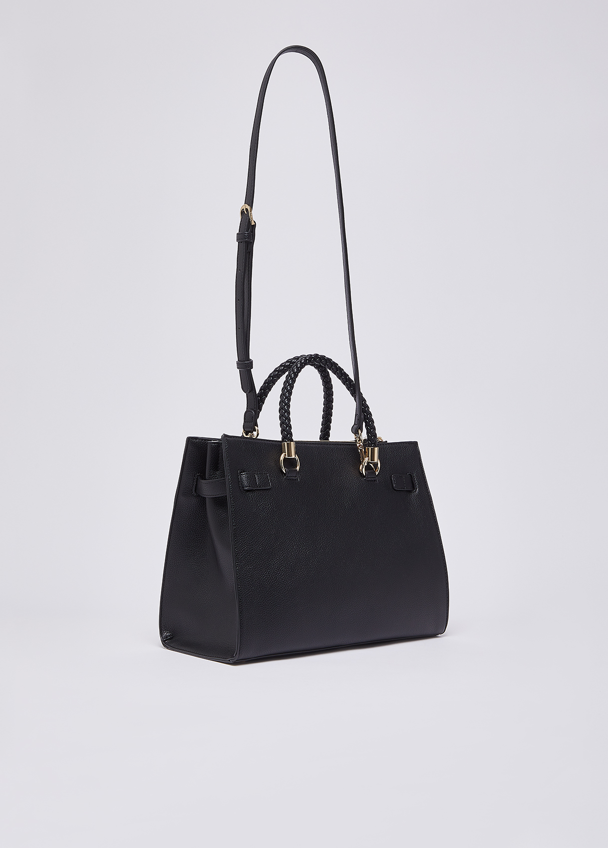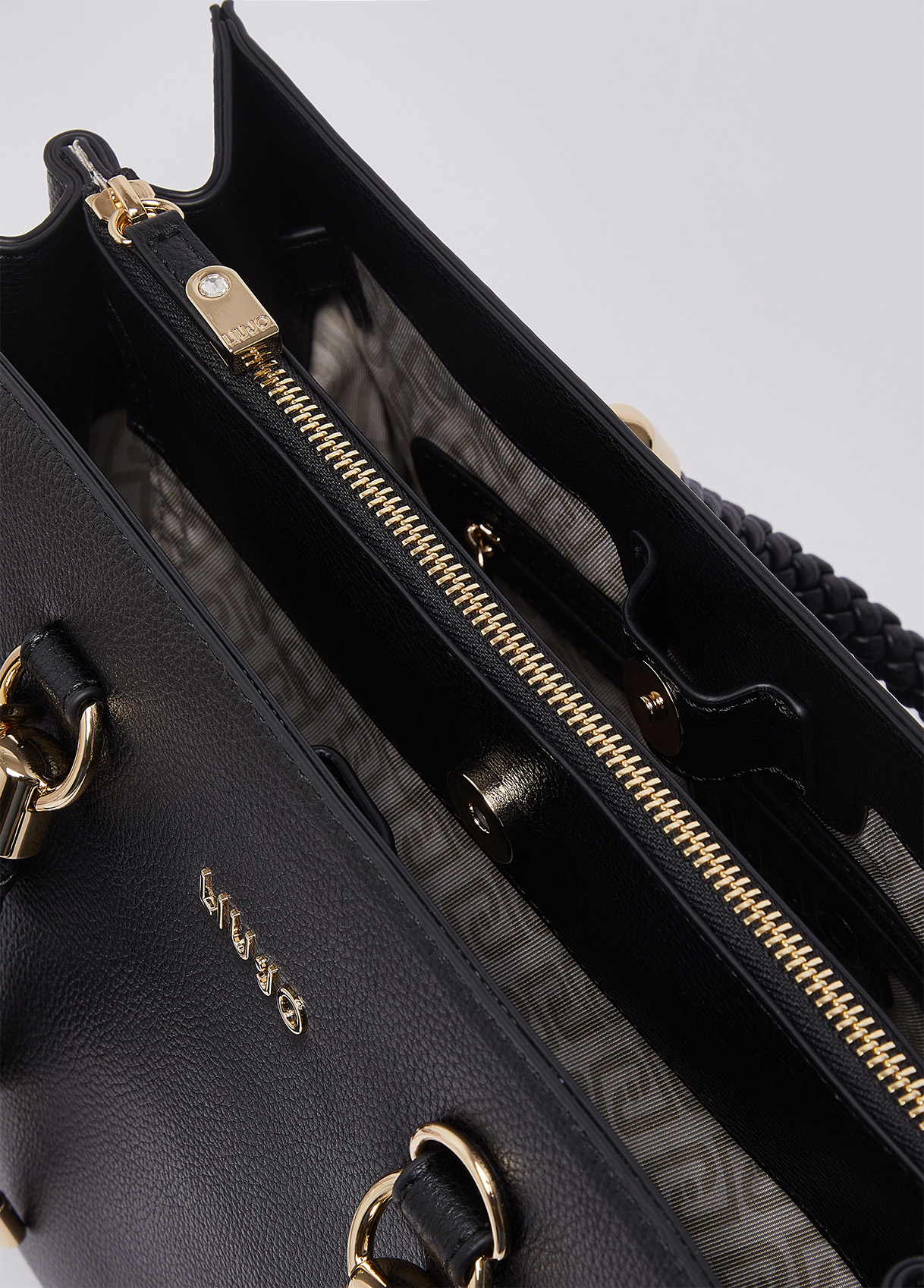 Measurements: 31 x 17 x 26 cm Medium black bag Satchel model Drummed effect Internal lining with logo Two zip-up compartments Central compartment closed with magnetic button Braided handles Matching colour charm Detachable shoulder strap Liu Jo Better product