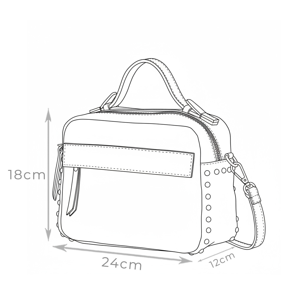 Poseta de dama Cora crem este realizata integral din piele naturala, avand aplicate pe laterala, pentru un plus de originalitate, tinte metalice. Captuseala interioara este confectionata din material textil. Este prevazuta cu maner pentru purtarea in mana dar si cu bretea de umar detasabila, reglabila. Dispune de un compartiment interior spatios, inchis cu fermoar dublu. MATERIAL: piele naturala DIMENSIUNI (inaltime x latime x adancime): 18 x 24 x 12cm GREUTATE: 350g COMPARTIMENTE: un compartiment BUZUNARE: buzunar interior cu fermoar, buzunare interioare fara fermoar; buzunar exterior cu fermoar SISTEM DE PRINDERE: maner + bretea de umar detasabila, reglabila (60-115cm) CULOARE ACCESORII: argintiu