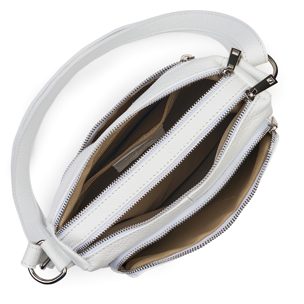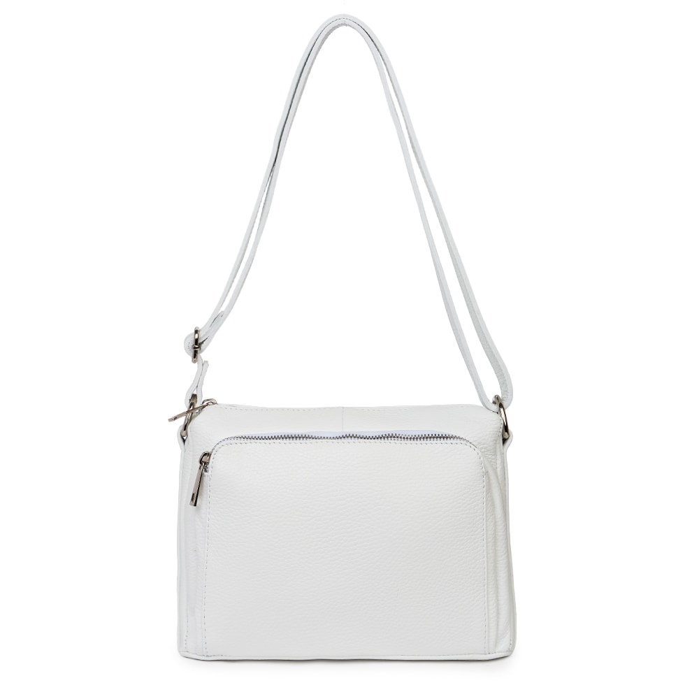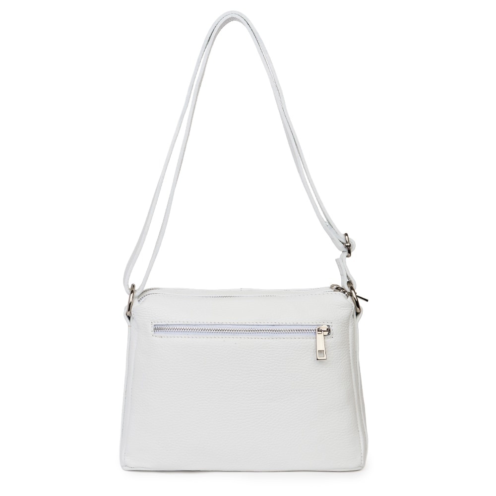 Poseta de dama din piele naturala Vania alba este un model crossbody, ideal pentru un stil de viata activ. Realizata din piele naturala cu textura granulata, ea imbina durabilitatea cu un design minimalist si modern. Cele doua compartimente principale, inchise individual cu fermoare metalice, permit o organizare impecabila a obiectelor personale. Buzunarul frontal exterior adauga un plus de practicalitate, fiind ideal pentru acces rapid la telefon sau chei. Bareta lata din piele asigura un confort sporit pe umar, facand-o potrivita pentru purtarea zilnica. Este o piesa versatila, usor de integrat in tinute office sau casual, oferind o nota de rafinament discret oricarei aparitii. MATERIAL: piele naturala DIMENSIUNI (inaltime x lungime x latime): 20 x 27 x 10cm COMPARTIMENTE: doua compartimente separate BUZUNARE: buzunar exterior cu fermoar pe partea din spate, buzunar exterior mare cu fermoar pe partea din fata, buzunar interior fara fermoar SISTEM DE PRINDERE: bretea de umar reglabila, 60-130cm CULOARE ACCESORII: argintiu