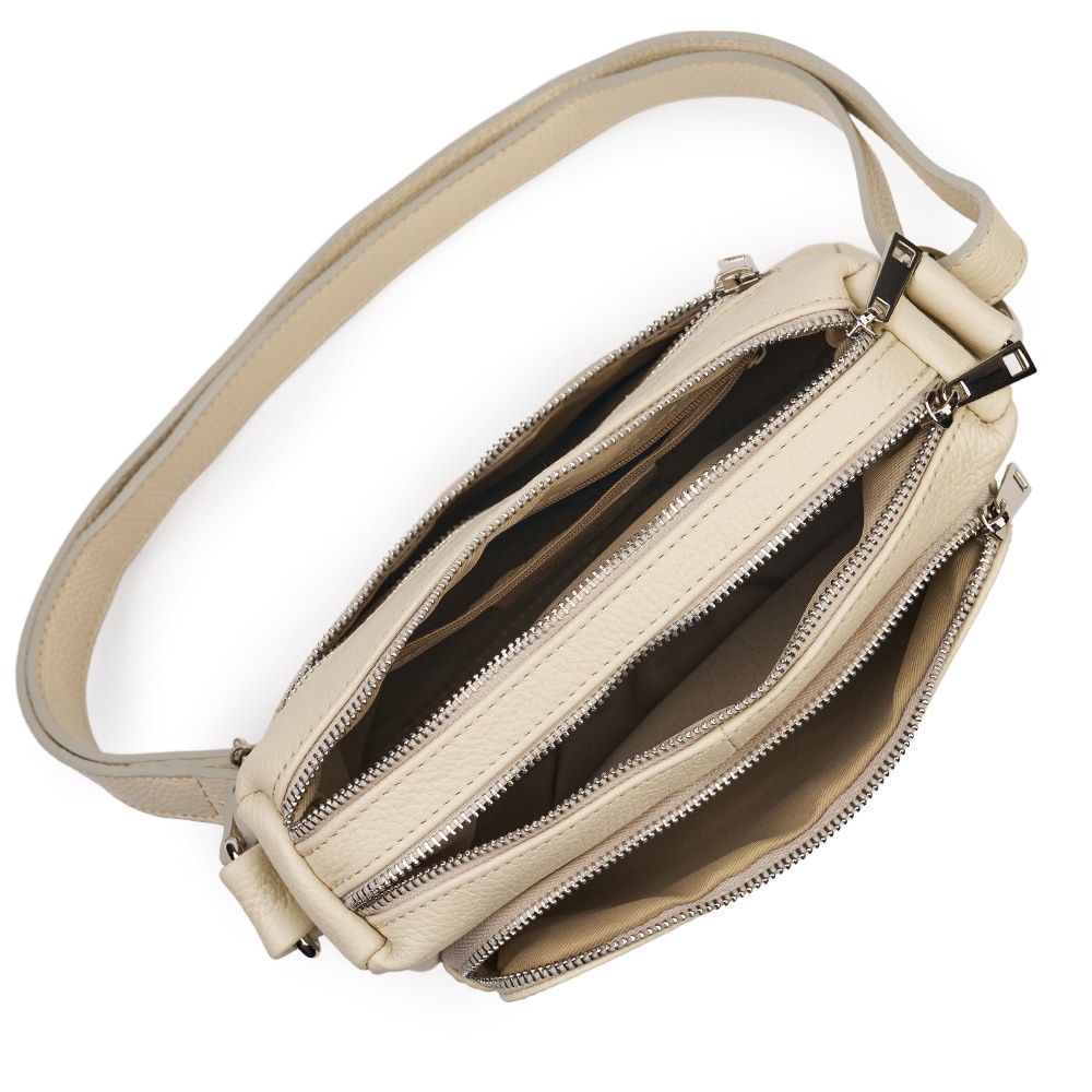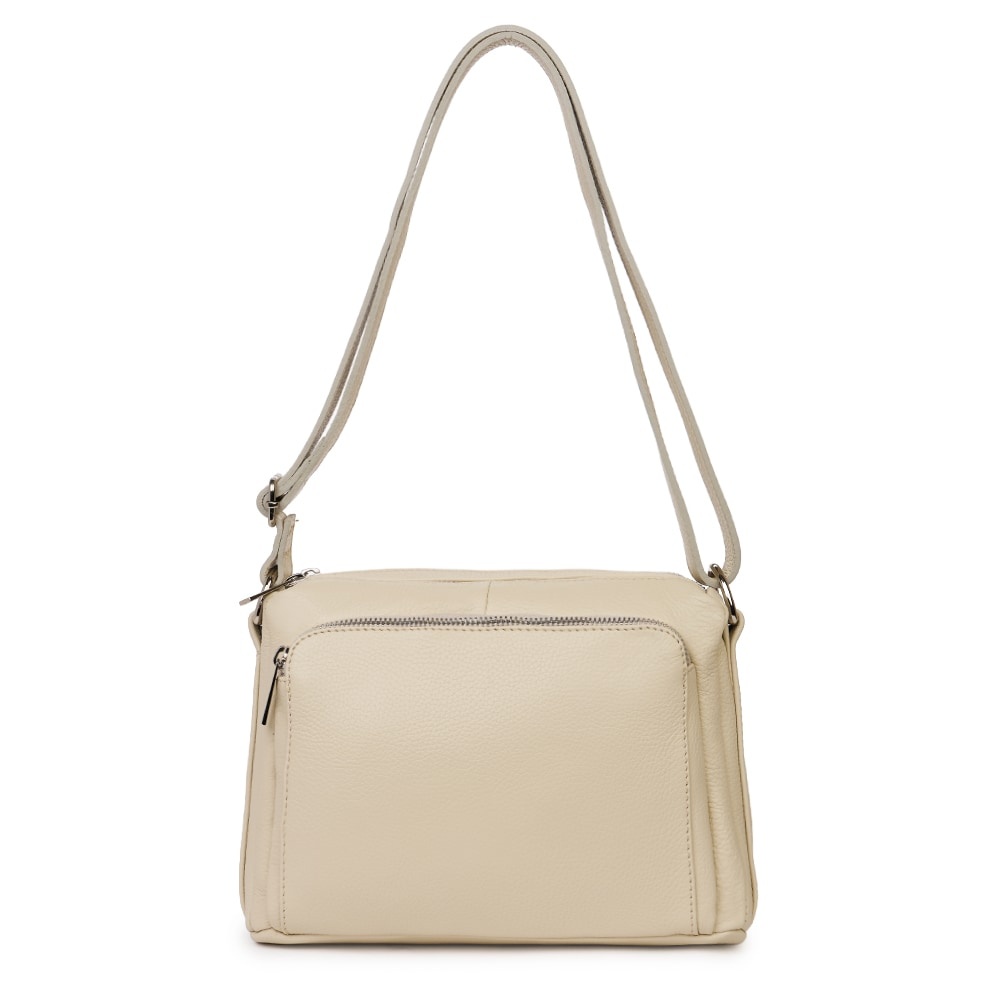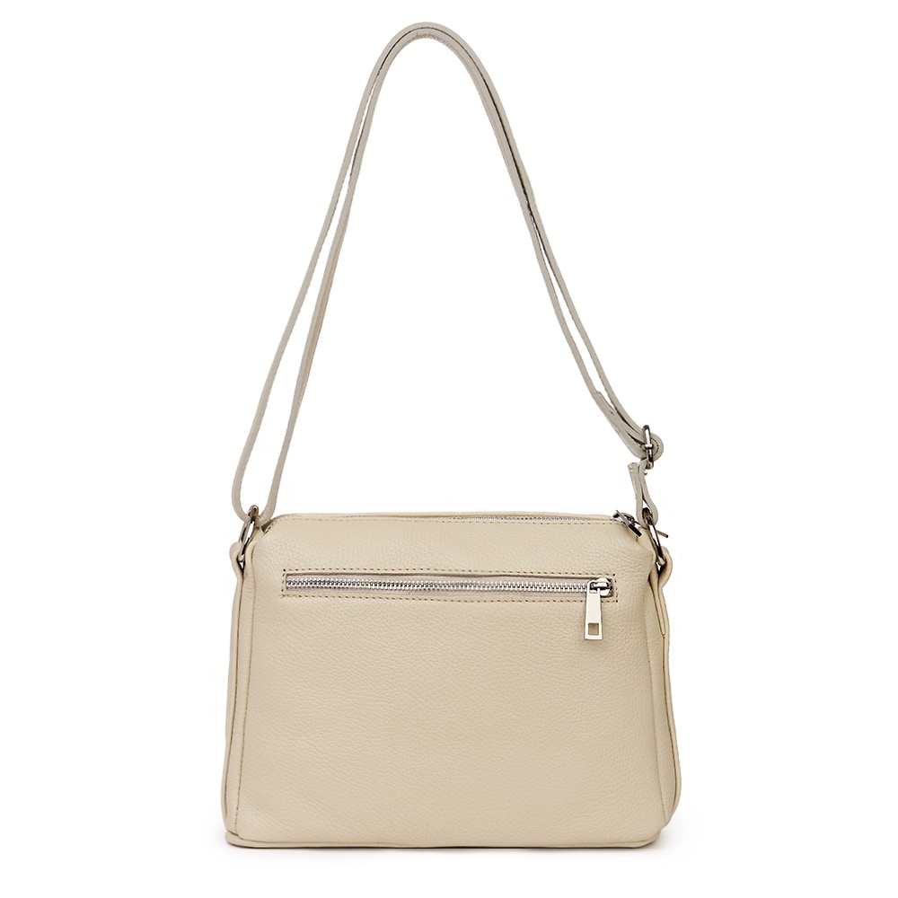 Poseta de dama din piele naturala Vania crem este un model crossbody, ideal pentru un stil de viata activ. Realizata din piele naturala cu textura granulata, ea imbina durabilitatea cu un design minimalist si modern. Cele doua compartimente principale, inchise individual cu fermoare metalice, permit o organizare impecabila a obiectelor personale. Buzunarul frontal exterior adauga un plus de practicalitate, fiind ideal pentru acces rapid la telefon sau chei. Bareta lata din piele asigura un confort sporit pe umar, facand-o potrivita pentru purtarea zilnica. Este o piesa versatila, usor de integrat in tinute office sau casual, oferind o nota de rafinament discret oricarei aparitii. MATERIAL: piele naturala DIMENSIUNI (inaltime x lungime x latime): 20 x 27 x 10cm COMPARTIMENTE: doua compartimente separate BUZUNARE: buzunar exterior cu fermoar pe partea din spate, buzunar exterior mare cu fermoar pe partea din fata, buzunar interior fara fermoar SISTEM DE PRINDERE: bretea de umar reglabila, 60-130cm CULOARE ACCESORII: argintiu