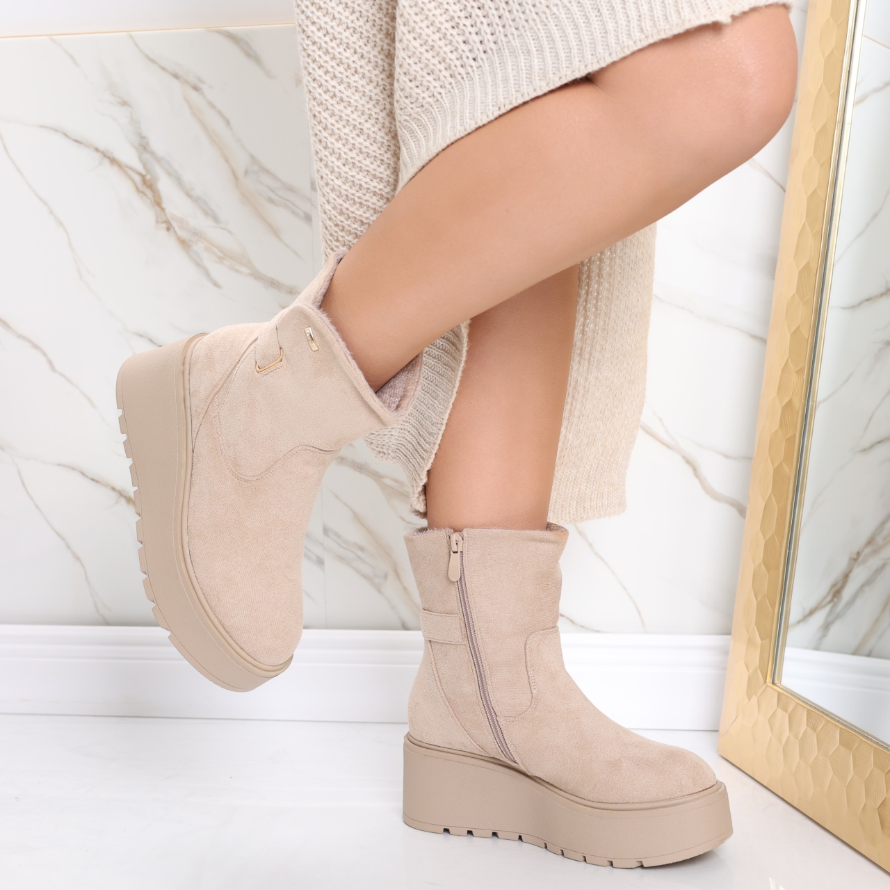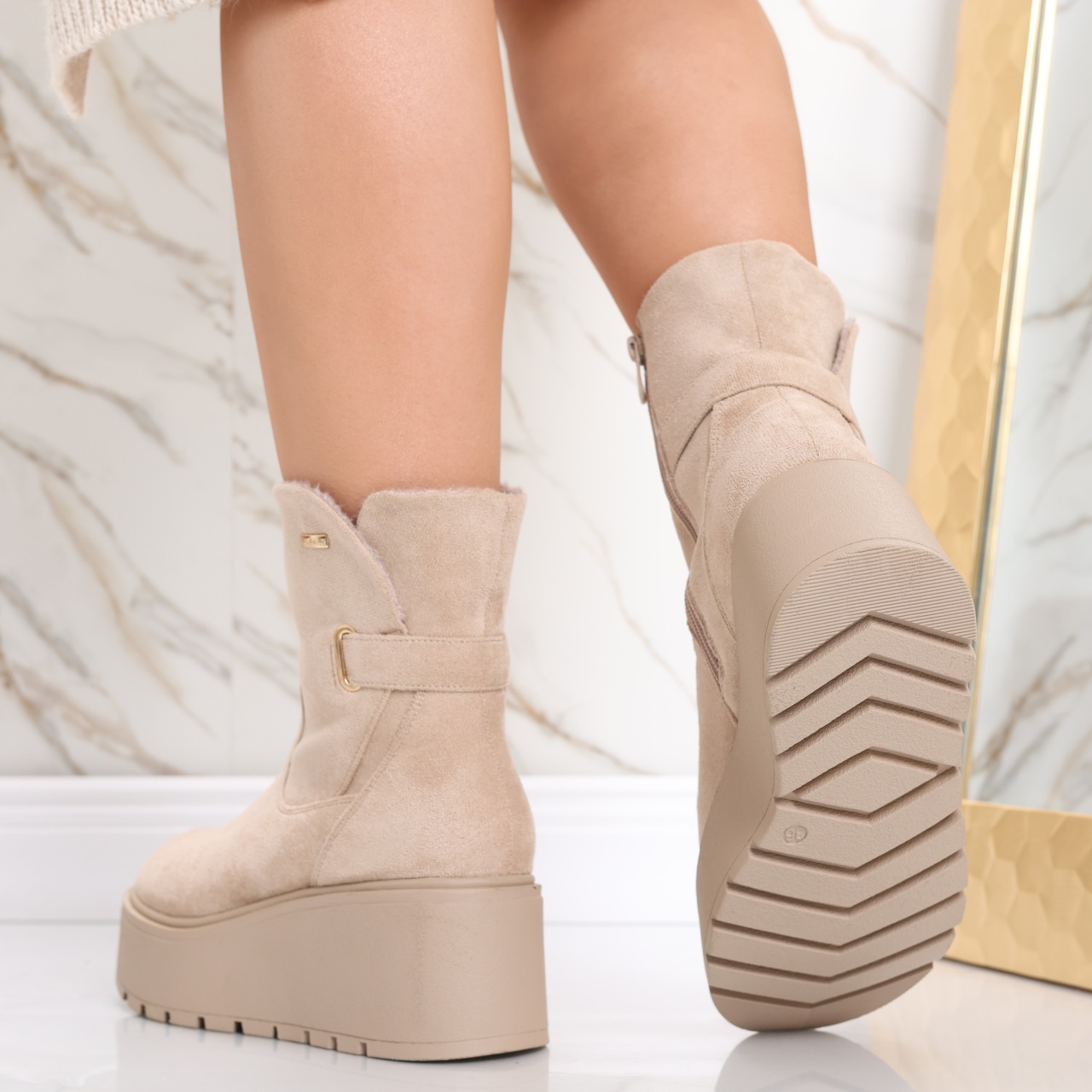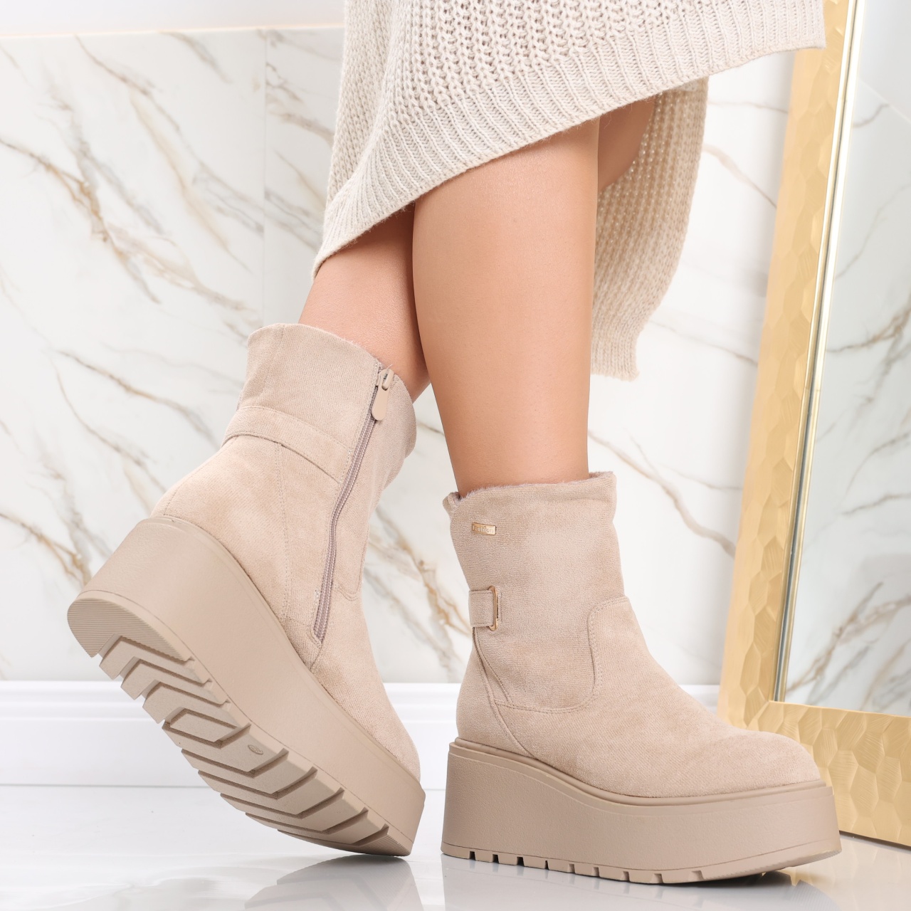 Special pentru femeile moderne care apreciază o combinație perfectă între confort și eleganță. Aceste ghete scurte au un interior căptușit, oferindu-ți o senzație plăcută pe tot parcursul zilei, mai ales în zilele mai răcoroase. Cu o platformă spate de 7 cm și o platformă față de 4 cm, ghetele Catrina îți oferă un plus de înălțime, fără a compromite stabilitatea, astfel încât să te poți simți încrezătoare și confortabil în fiecare pas. Versatilitatea ghetelor Catrina le face ideale pentru o varietate de ocazii. Culoarea elegantă și designul modern cu vârf rotund se potrivesc perfect la o multitudine de ținute. Fie că optezi pentru un look casual cu blugi și un pulover, fie că alegi o rochie elegantă pentru o seară specială, ghetele Catrina sunt alegerea perfectă pentru a-ți completa outfitul. Alege ghetele din piele ecologică întoarsă Catrina pentru a adăuga un element de stil și confort în garderoba ta. Fiecare pas va întări nu doar look-ul tău, dar și starea de bine, pregătindu-te să faci față oricăror provocări cu un zâmbet pe buze.