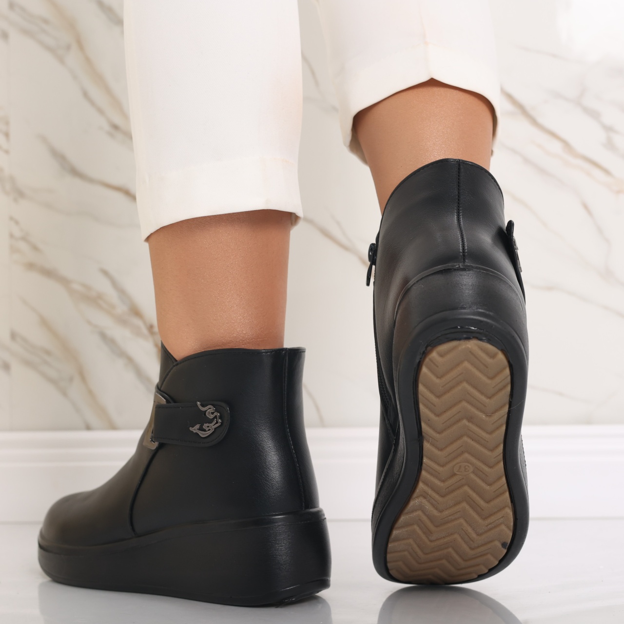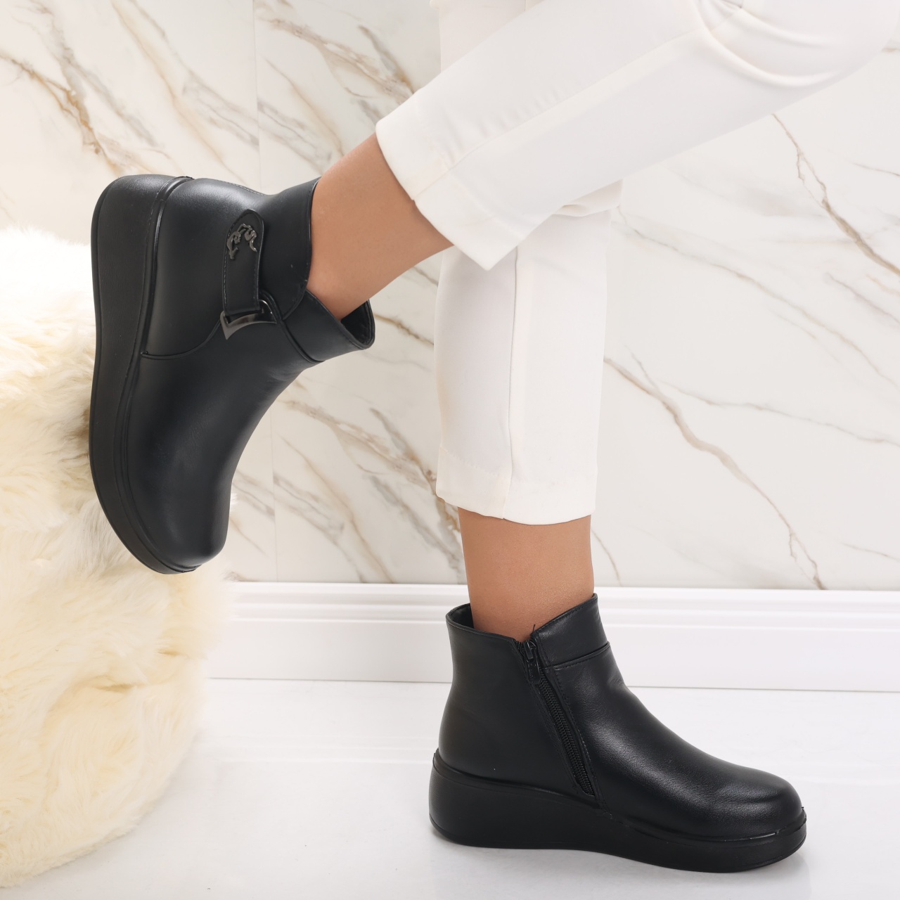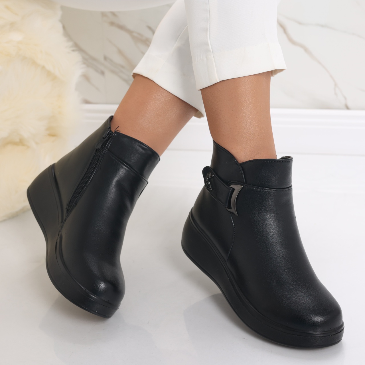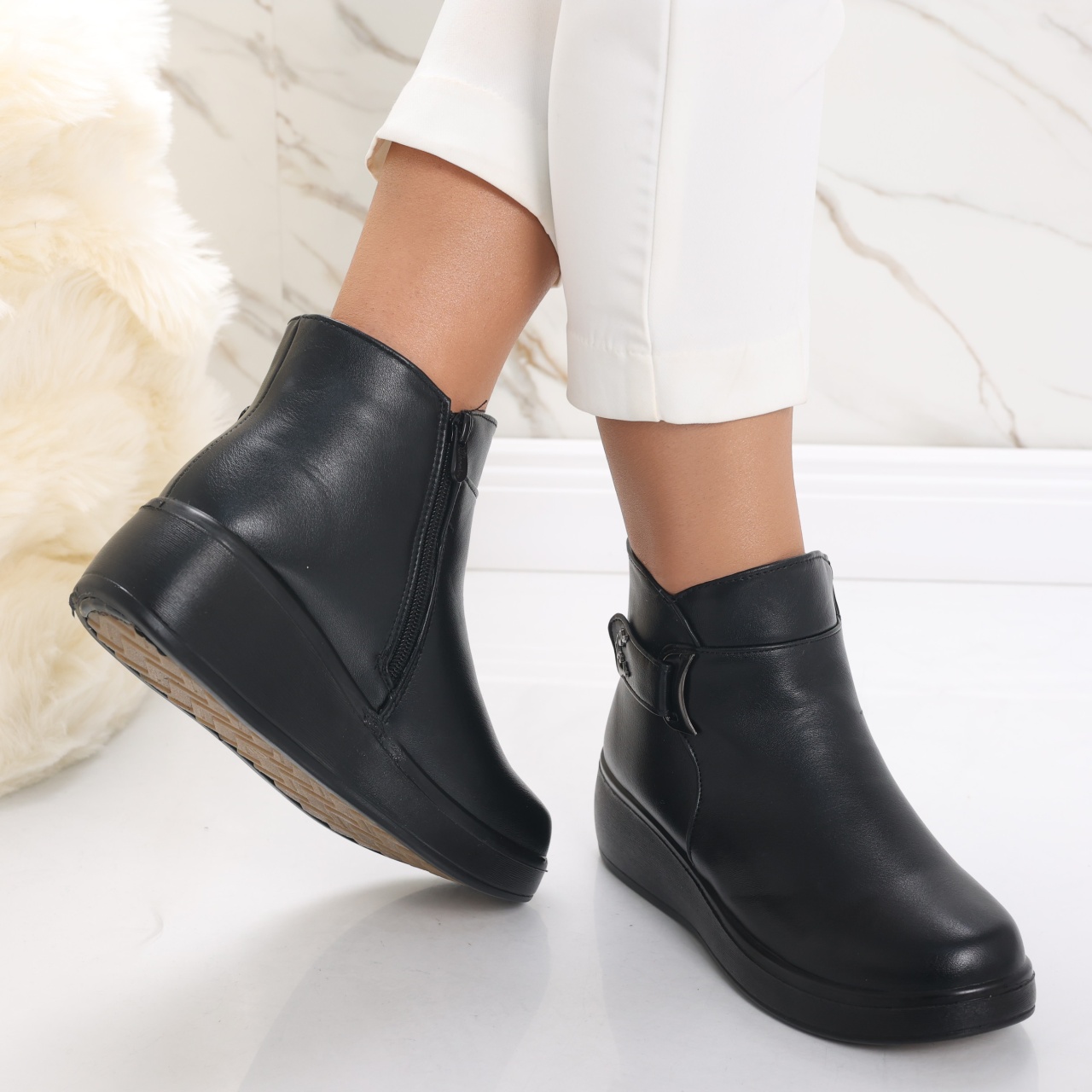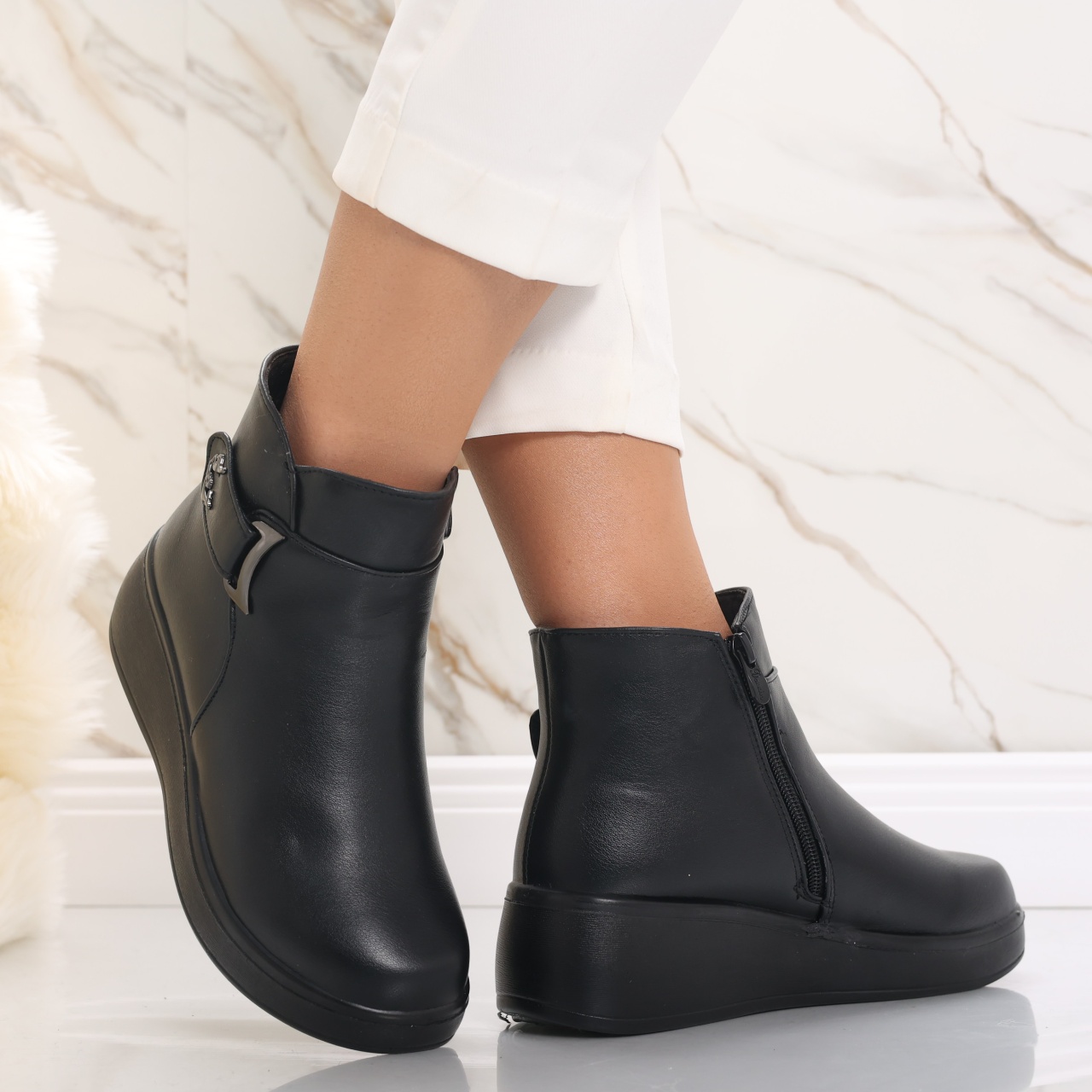 Transformă-ți garderoba cu ghetele imblănite Delisa, special concepute pentru femeile care pun accent pe confort și stil. Făcute din piele ecologică întoarsă, aceste ghete nu doar că îți mențin picioarele calde și ferite de frig, dar îți oferă și un look modern, potrivit pentru orice ocazie. Cu un toc de 4.5 cm și o platformă de 2.5 cm, fiecare pas devine o plăcere, asigurându-ți susținerea necesară pe parcursul zilei. Culoarea neagră adaugă un strop de eleganță, făcând aceste ghete extrem de versatile, ușor de asortat atât cu ținute casual, cât și cu cele mai rafinate. Alege căldura, confortul și stilul într-un singur produs și fă-ți fiecare zi mai specială! Investește în ghetele Delisa și lasă-ți stilul să vorbească de la sine – e timpul să strălucești!