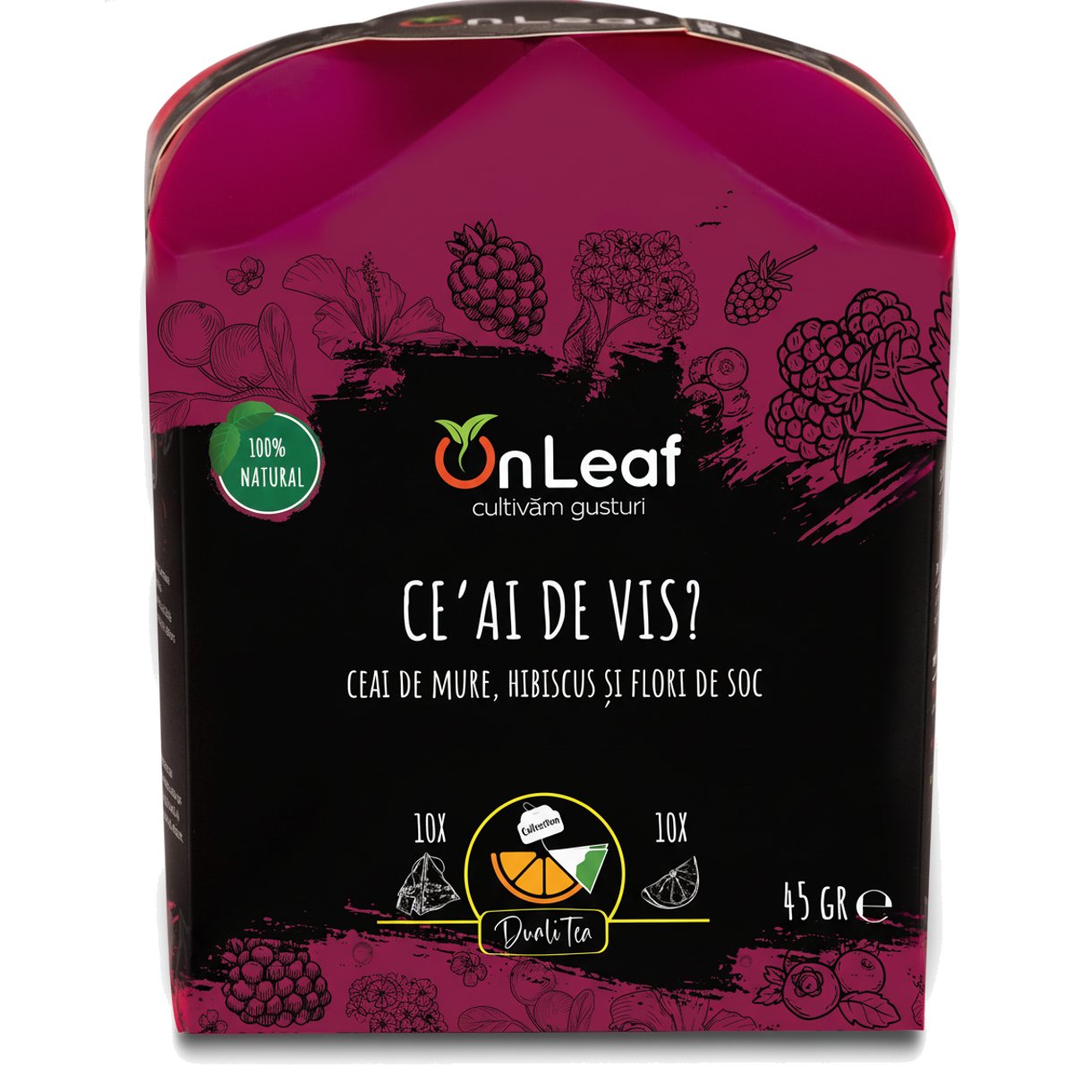 Ceai de Vis? | 10 pliculețe pentru infuzie & 10 fructe deshidratateUn vis pe care-l savurezi cu ochii deschiși… ✨ Fiecare înghițitură te duce mai aproape de aromele proaspete ale pădurii: note acrișoare, fructate, proaspăt aromate, dulci și florale. Deci.. vis sau realitate? Poți să decizi doar când ai „Ce’ai de vis?” în ceașca ta! DualiTea Collection: Alege să alegi Colecția de ceai care răspunde cu brio la întrebarea „Ce’ai bea azi?” ☕ Orice ocazie, planificată sau complet neașteptată, poate fi mai aromată. „Ce’ai de dimineață?” la micul dejun sau „Ce’ai de povestit?” pe seară, la o întâlnire cu cei dragi, sunt doar două dintre cele 8 întrebări la care ceaiurile noastre au răspunsul.Mai mult: deschizi cutia și găsești 10 pliculețe de ceai + 10 fructe deshidratate. De ce? Pentru că poți să adaptezi gustul după preferințele tale! Vrei ceva mai acrișor sau… poate mai dulce? Cu DualiTea, e simplu: Gust mai dulce? Adaugă o felie de banană sau măr O notă acrișoară? Lămâia nu lipsește din pachet! Tentă amăruie? Folosește grapefruit (promitem că ziua nu se amărăște, doar infuzia ).➕ Și lista continuă cu fiecare infuzie și fruct Infuzie curată, fără plastic! Pliculețele noastre sunt fabricate din 100% fibră de porumb, un material natural și biodegradabil. ♻️ Nu eliberează microplastic în apa fierbinte și asigură o infuzie pură a amestecului de ceai. ✨Infuzia decurge cam așa: Pune pliculeţul de ceai la infuzat în apă fierbinte , apoi adaugă fructul dorit , în funcţie de starea ta. Și așa: Îţi pui amprenta! ✨Informații SuplimentareCantitate netă: 45 grame A se păstra la loc uscat si răcoros!
