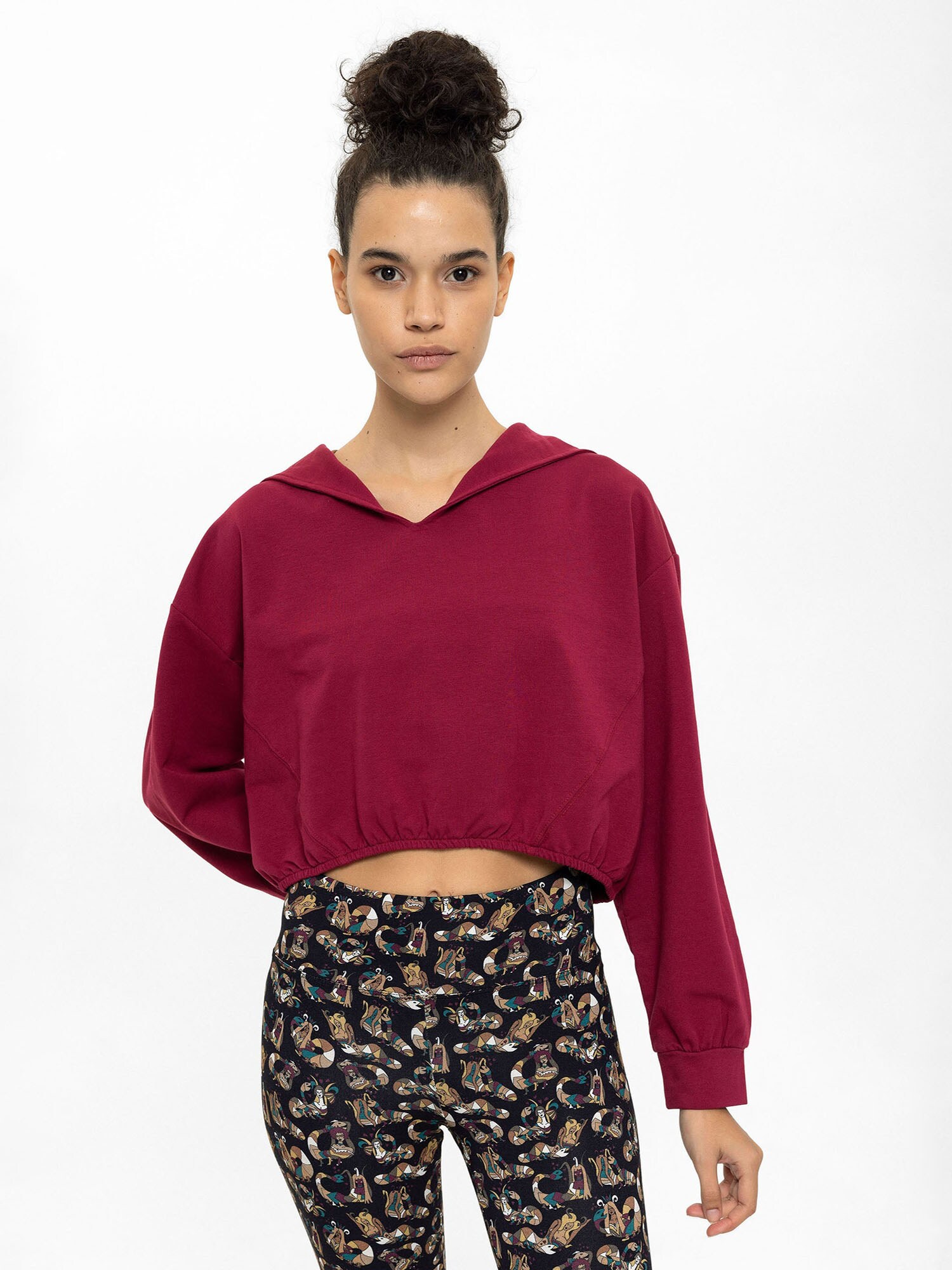 Material: Material sweat; Decolteu: Cu glugă; Imprimeu: Monocrom; Detalii: Drapat; Croi: Croi lejer; Lungime mâneci: Mâncecă lungă; Lungime: Croi scurt