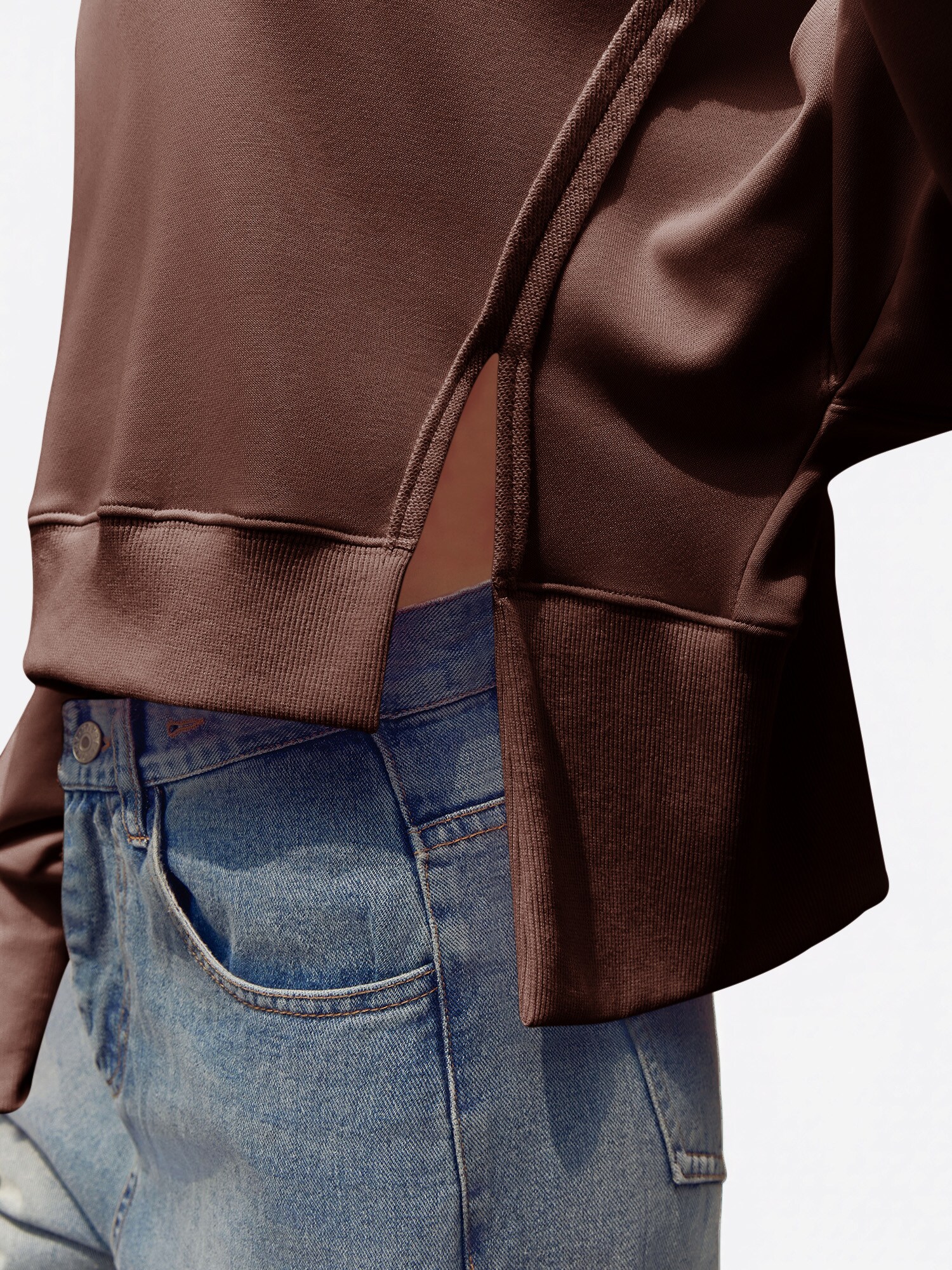 Design: Șliț lateral, Croi mai lung la spate; Material: Material sweat; Decolteu: Decolteu rotund; Imprimeu: Monocrom; Detalii: Cusături ton în ton, Material delicat; Croi: Croi larg; Lungime mâneci: Mâncecă lungă; Lungime: Lungime normală