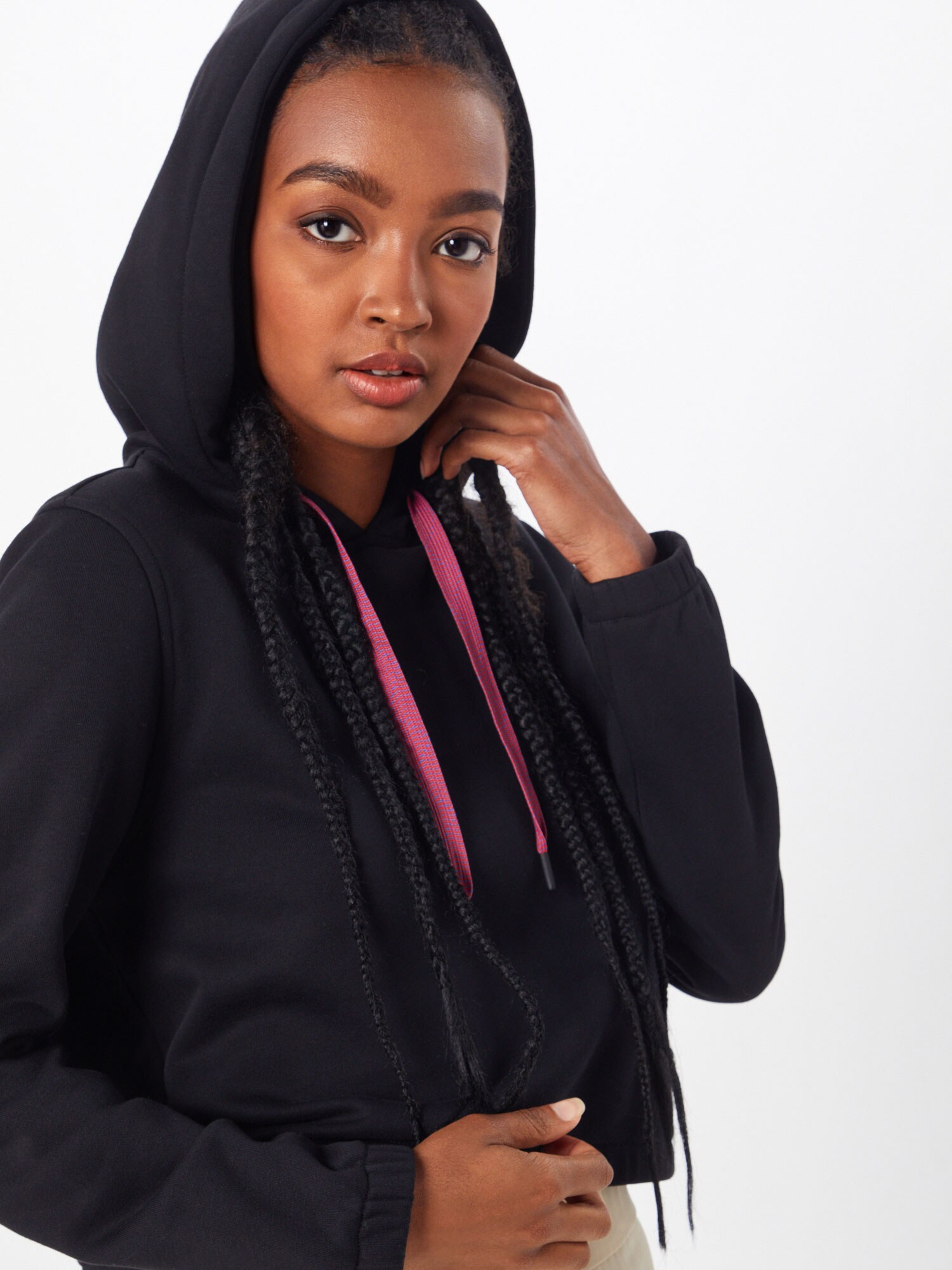 Design: Tiv/ margine tighelită, Tiv drept, Croi drept, Glugă cu șiret; Material: Material sweat; Decolteu: Cu glugă; Imprimeu: Monocrom; Detalii: Cusături ton în ton, Interior ușor aspru, Material moale; Croi: Croi normal; Lungime mâneci: Mâncecă lungă; Lungime: Croi scurt