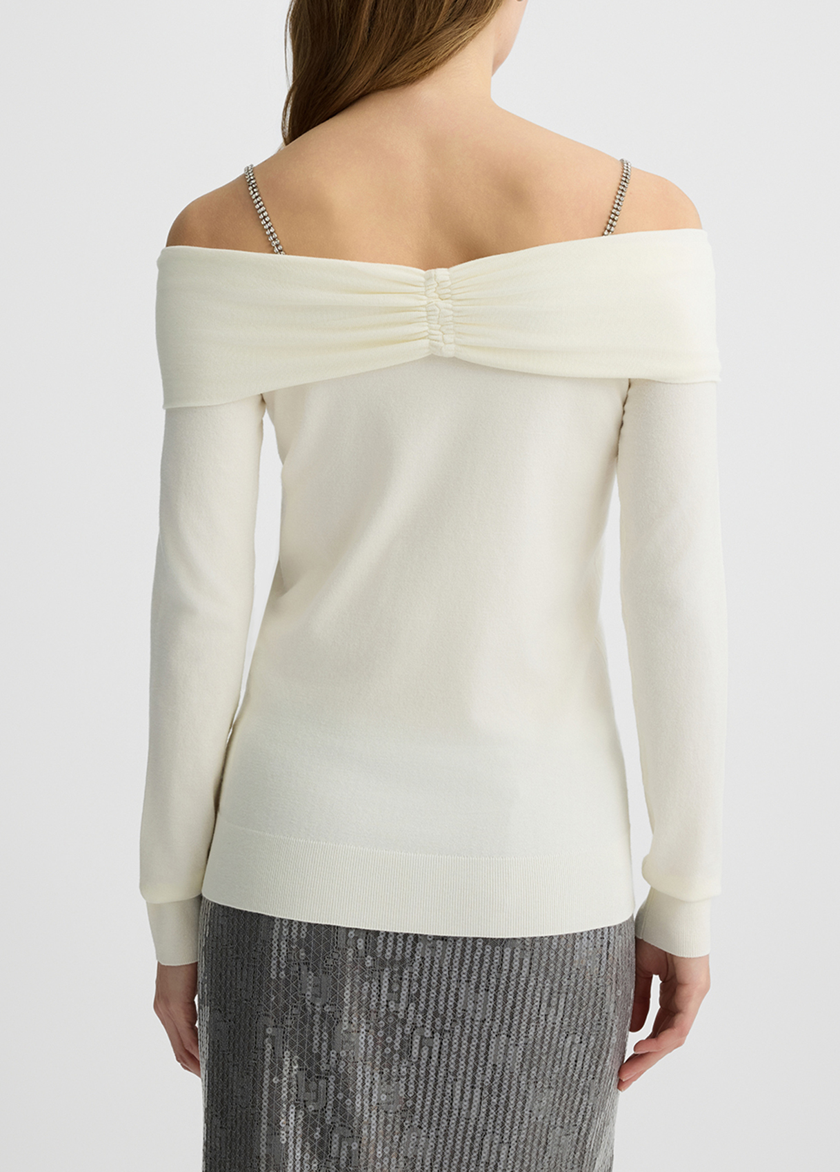 White jumper with viscose-blend yarns Bardot neckline Supported by thin shoulder straps Appliqué bejewelled gemstones Long sleeves
