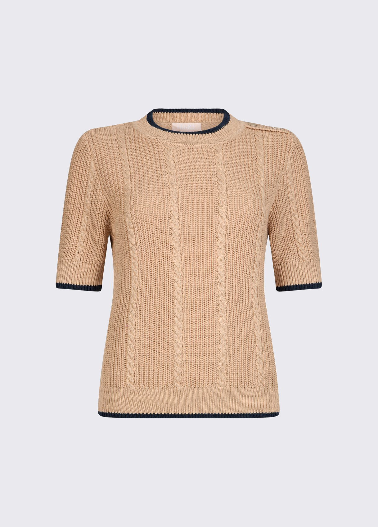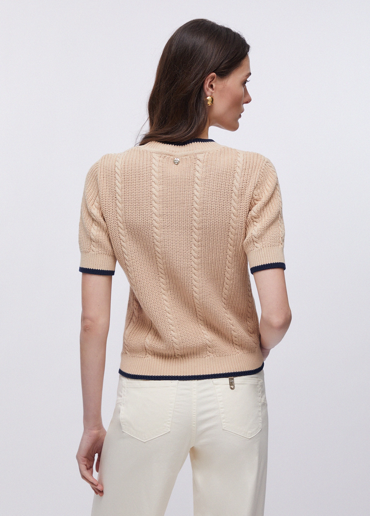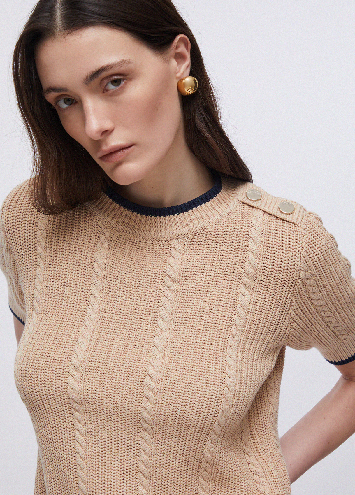 Knit jumper Pure cotton yarns Cable knit Decorative buttons on the shoulder Contrasting trims