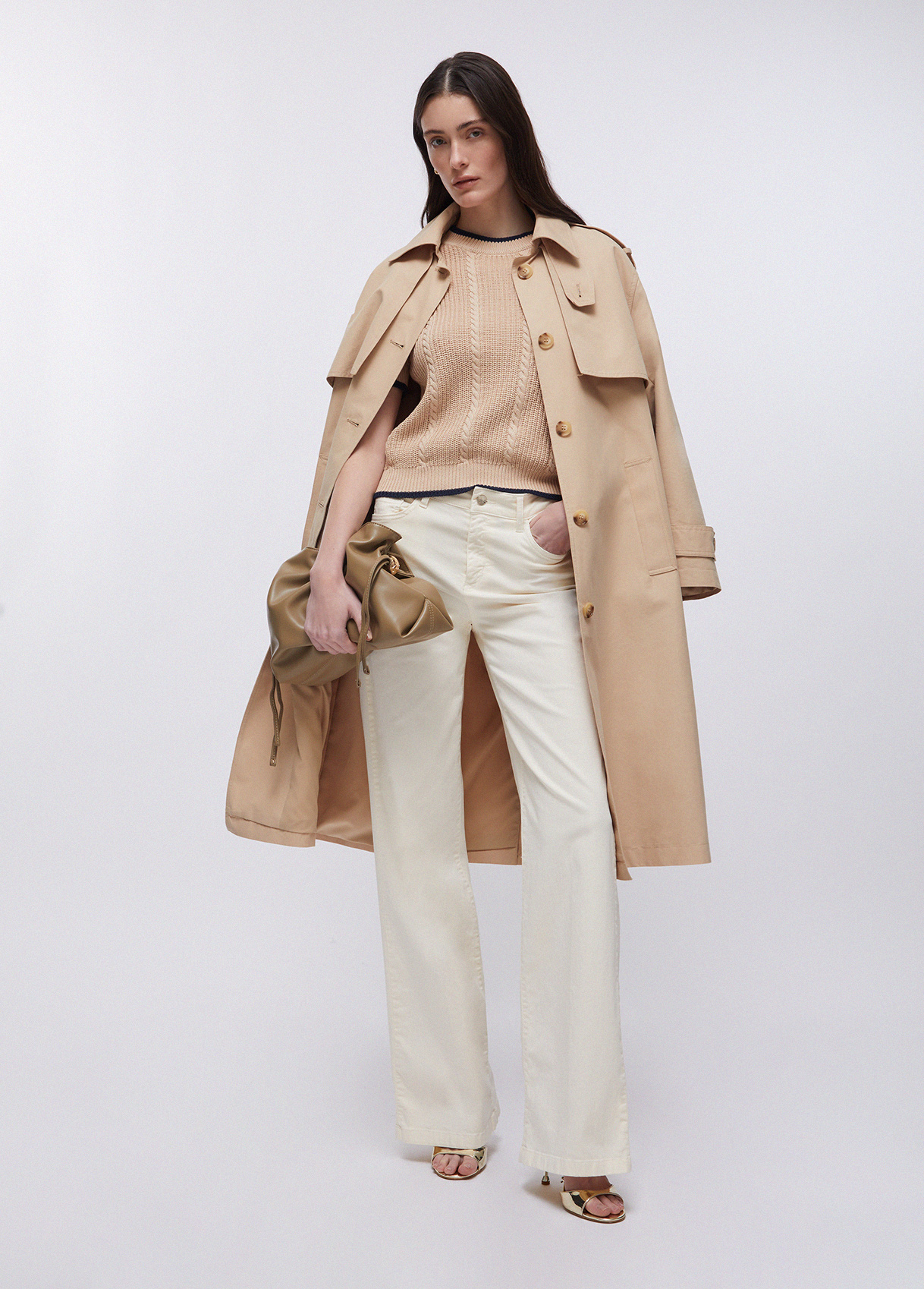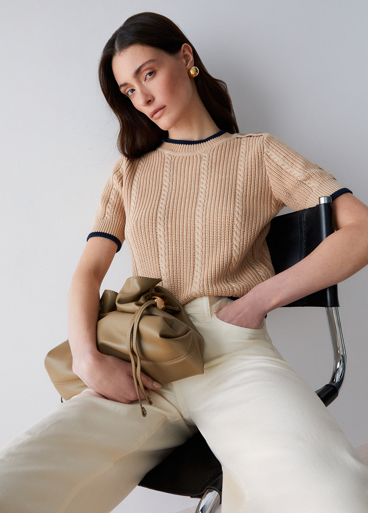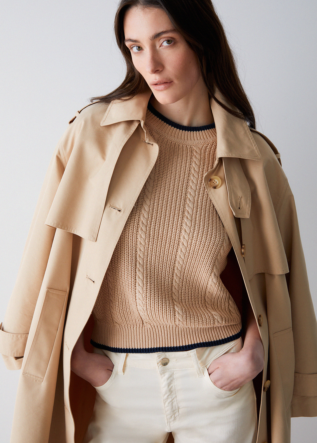 Knit jumper Pure cotton yarns Cable knit Decorative buttons on the shoulder Contrasting trims