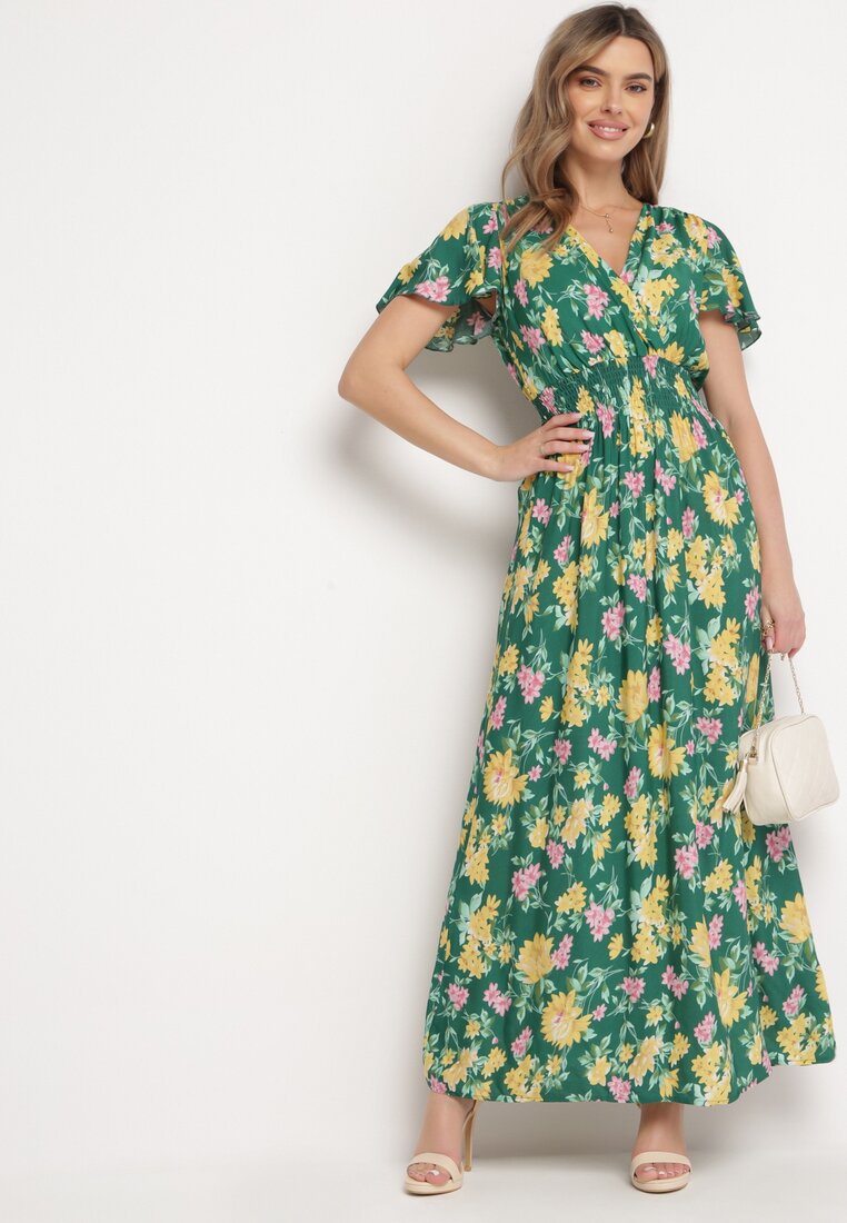 Rochie Maxi Verde-Galbenă din viscoză, cu croială evazată și decolteu petrecut, florală Arvelia.