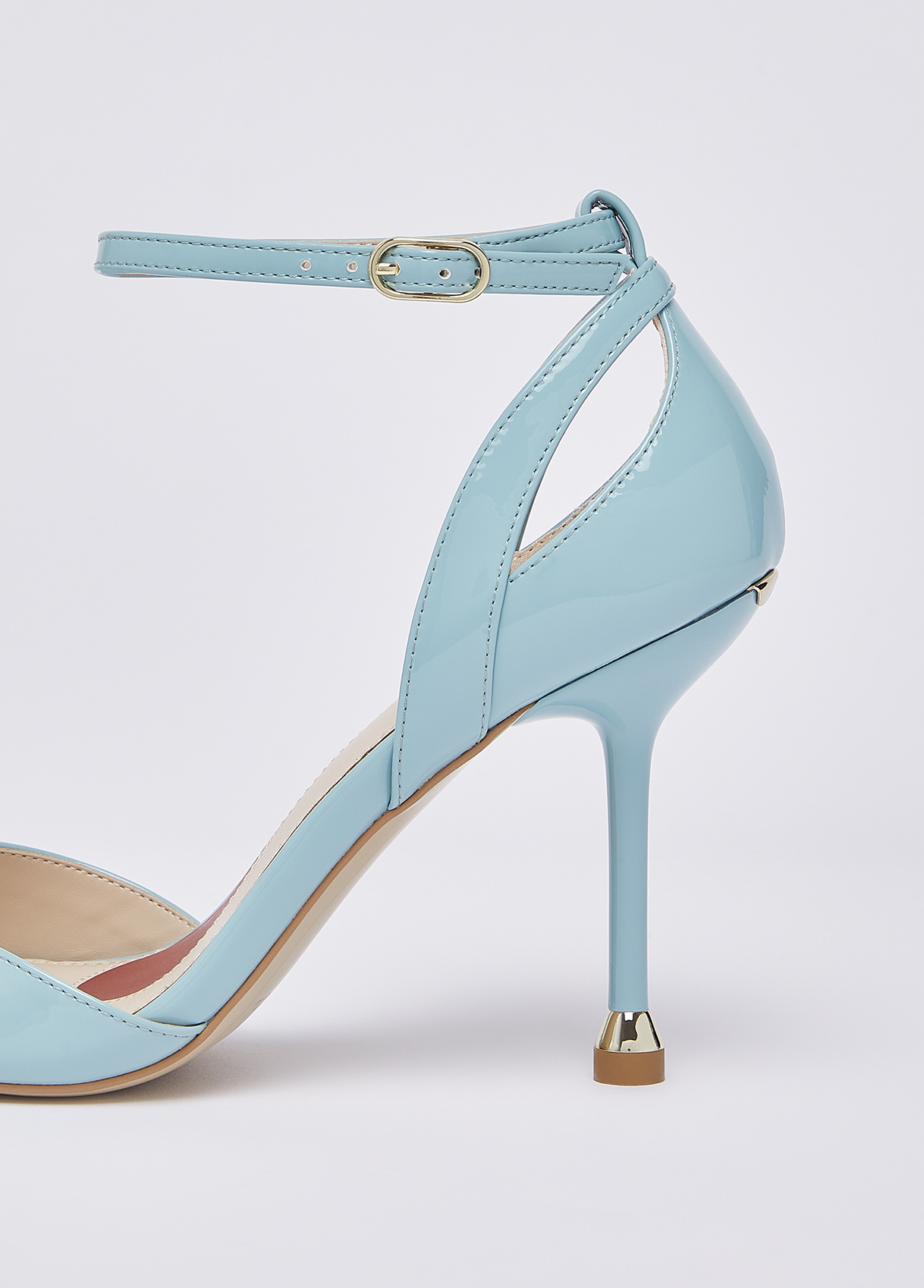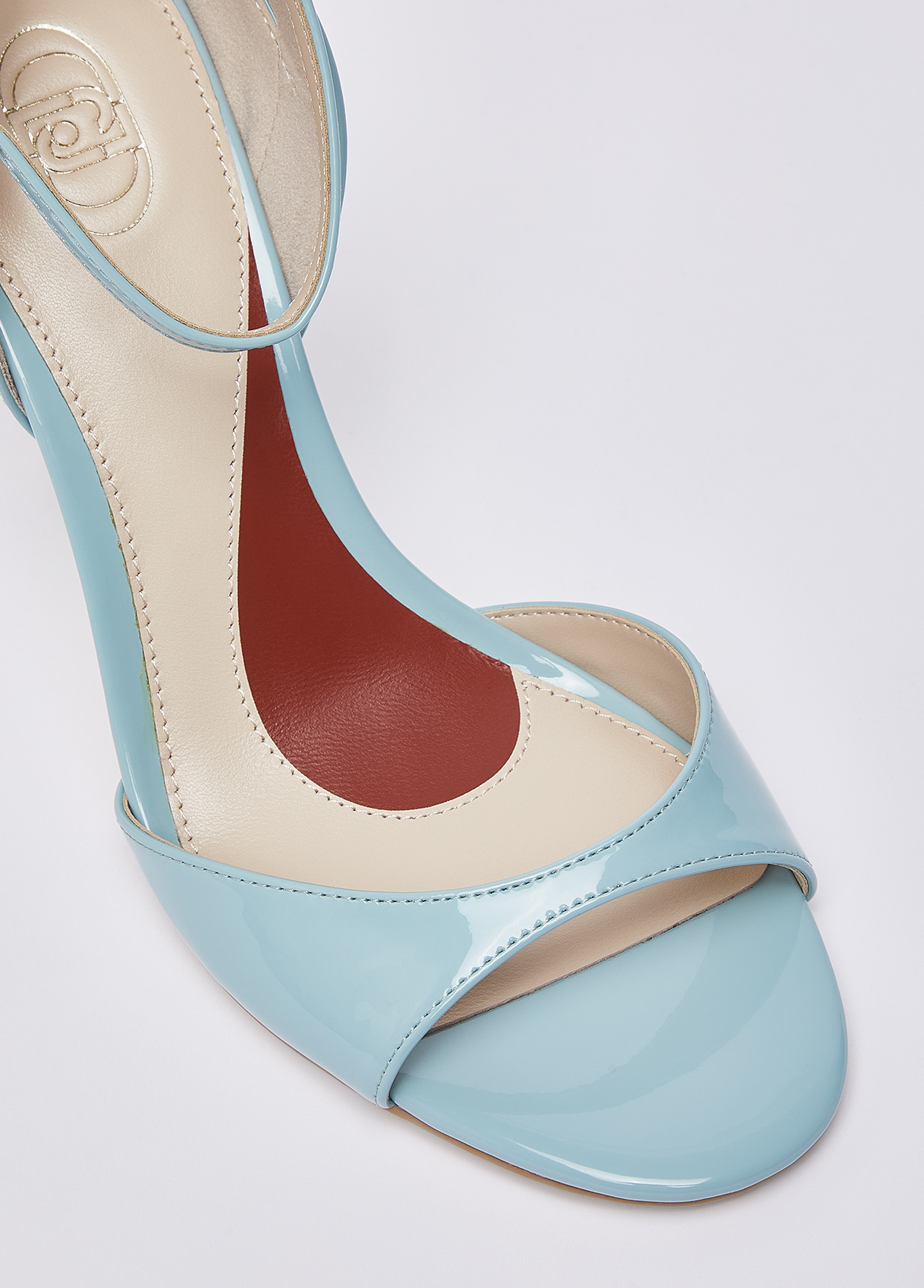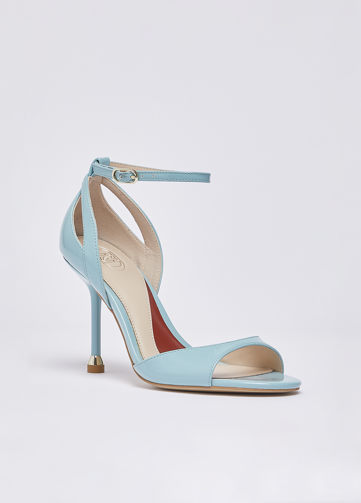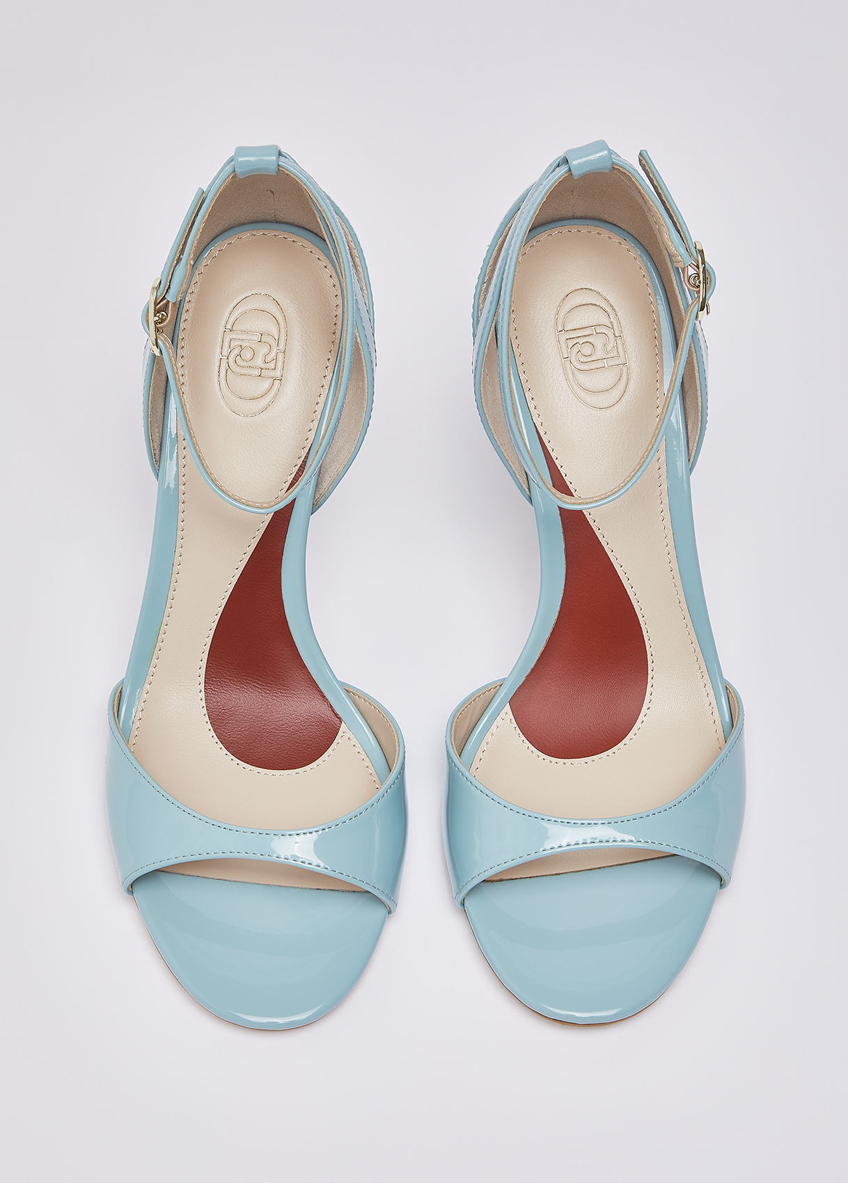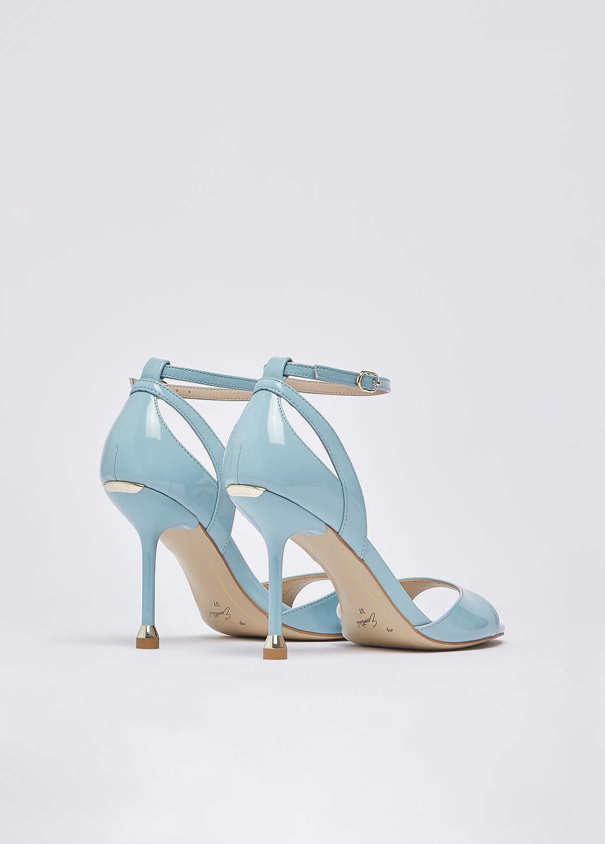 The new iconic My Liu Jo Essentials sandals in turquoise patent leather, with essential lines and a distinctive Liu Jo heel, they outline a feminine, modern and irresistible silhouette. Perfect for wearing with an evening look or for adding a sophisticated edge to your everyday wear. Sandals with patent leather upper Cut-out Ankle strap The heart-print insole complements the pair, a sign of love and signature Liu Jo style Branded bi-material sole with print My Liu Jo Essential Stiletto heel with iconic metallic detailing Heel height: 9.5 cm