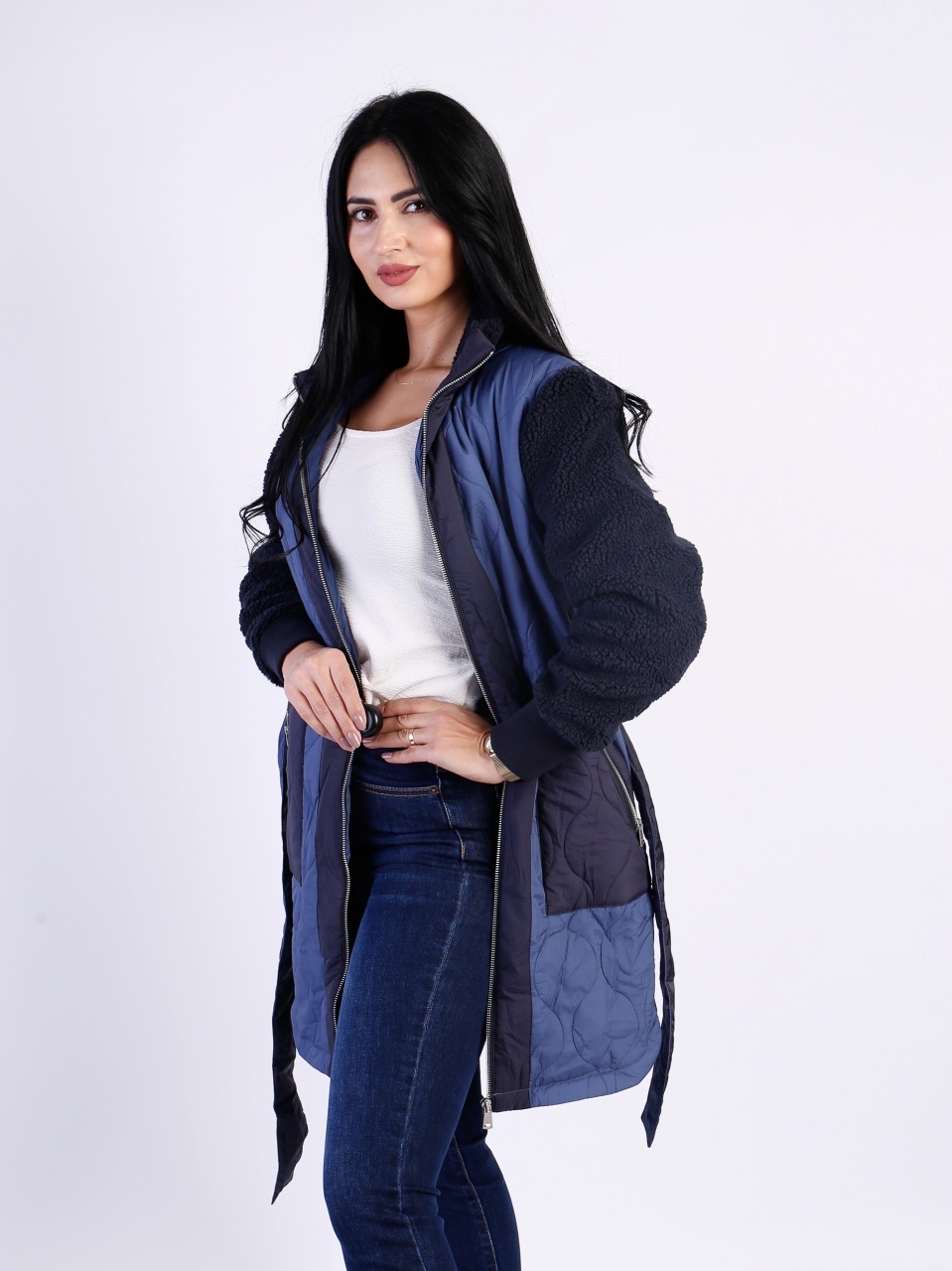 Geacă damă lungă de iarnă matlasată, realizată într-o nuanță elegantă de albastru închis. Model modern cu fermoar frontal, buzunare laterale și cordon ajustabil în talie care evidențiază silueta. Mâneci texturate și croială confortabilă, perfectă pentru zilele reci de iarnă. O alegere practică și stilată atât pentru ținutele casual, cât și pentru cele elegante.