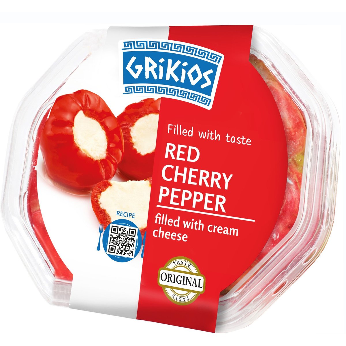Grikios Ardei rosii cherry umpluți cu crema de branza in ulei de rapița Iata un ardei cherry care s-a copt la soarele fierbinte pentru a-ți ispiti privirea cu culoarea rosie frumoasa si a-ți seduce papilele cu nuanța sa fructata de aroma intensa. Ce este atat de special la asta? Tot! Cu toate acestea, simțurile noastre vor fi cel mai mult saturate de miezul sau unic, umplut pana la refuz cu o crema de branza catifelata. De asemenea, trebuie adaugat ca aceste delicatese sunt scaldate intr-o marinata care va mangaia palatul cu un mozaic de arome mediteraneene. in cele din urma, pregatirea gustarilor unice va deveni o joaca de copii, in timp ce ardeii cherry cu branza va permit sa va tratați familia si prietenii cu delicatese mediteraneene de fiecare data. Acum, alaturi de gustarile delicioase, poți crea si o atmosfera speciala care sarbatoreste cu gust fiecare moment petrecut la masa alaturi de cei dragi. Produsele marca Grikios te vor ajuta sa descoperi adevaratul gust al Greciei, iar fiecare muscatura te va face sa vezi privelisti pitoresti cu cele mai frumoase peisaje ale arhipelagului.Grikios este o calatorie intr-o lume culinara plina de arome, inspirata de o bucatarie mediteraneana diversificata si energica. Este o calatorie cu un brand de produse care este renumit si recunoscut la nivel internațional. Cand vorbim despre brandul Grikios, imaginația noastra ne duce pe plajele insorite ale Mediteranei. Ne amintim de gustul bucatariei locale si de placerea de a manca.+2 °C - +7 °CTime for lunch! We suggest crunchy toasts accompanied by paprika balls hiding cream cheese. Sounds delicious, doesn’t it? When a few hours pass and it’s dinner time, you can then charm the palates of your family by serving unique antipasto, or use Grikios’s Mediterranean snacks as a side dish to roast meat or pasta. Peppers stuffed with cheese are also great on pizza or a traditional casserole! When you invite your guests to a banquet at home or a garden party, these special snacks will be a great substitute for ordinary finger foods, tasting great with a glass of wine or a glass of dark beer. In short, no occasion is too good to quickly transform an ordinary meal into a Mediterranean feast!