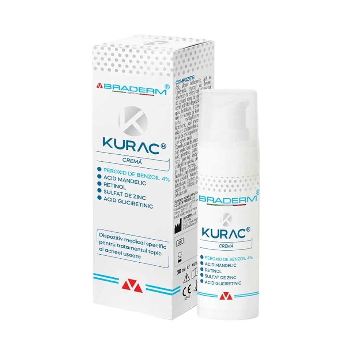 Kurac crema pentru tratamentul acneei Descriere: Kurac este un preparat farmaceutic cu o formula unica pe baza de Peroxid de benzoil, indicat in tratamentului acneei vulgare usoare si moderate. Datorita principiilor sale active, Kurac elimina cosurile, reduce inflamatia locala si impiedica inmultirea bacteriilor care cauzeaza aparitia acneei, cu rezultate vizibile inca din primele saptamani de tratament. Nu are in compozitia sa antibiotic care poate favoriza dezvoltarea rezistentei bacteriene si nici retinoid farmaceutic, fiind bine tolerat si de pacientii cu tenul acneic, sensibil. Actiune: Eficienta demonstrata clinic; Peroxid de benzoil 4%- elimina cosurile, impiedica inmultirea bacteriilor care cauzeaza acneea, reduce seboreea si inflamatia; Sulfat de Zinc 1%- reduce secretia excesiva de sebum, efect antibacterian; Retinol 0.5%- elimina punctele albe si negre, favorizeaza penetrarea mai buna a produsului in foliculul pilosebaceu; Acid Mandelic 1%- agent exfoliant bland cu efect keratolitic si antibacterian; Acid Gliciretinic si Fitosfingozine- substante cu efect hidratant si antiinflamator. Indicatii: Tratamentul local al acneei vulgare usoare si moderate Mod de administrare: Dupa curatarea zonei cu un produs specific, aplicati crema pe zonele care necesita tratamentul, 1-2 aplicari pe zi minim 1 luna. Precautii: in general KURAC este bine tolerat. Este posibil totusi ca in unele cazuri sa se manifeste eritem local, prurit sau uscaciune excesiva a tegumentului. Utilizarea prelungita a produsului poate sa determine o sensibilizare excesiva a zonei, caz in care se recomanda intreruperea tratamentului. Comunicati medicului dumneavoastra orice manifestare neplacuta aparuta in timpul tratamentului. Zonele tratate nu trebuie expuse la soare sau surse artificiale de radiatii UV. Evitati contactul produsului cu ochii sau mucoasele nazale si orale; daca produsul intra in contact cu ochii, spalati imediat cu multa apa. A nu se aplica produsul copiilor sub 12 ani. Avertizari: A nu se utiliza in caz de hipersensibilitate la oricare dintre componentele produsului. A nu se utiliza in timpul sarcinii si alaptarii. A nu se aplica pe leziuni deschise. A nu se utiliza in caz ca tubul este deteriorat. Consultati medicul inainte de utilizarea produsului impreuna cu alte preparate pentru uz topic. Precautii speciale de pastrare: Pastrati produsul intr-un loc racoros, la temperaturi sub 40°C, ferit de surse directe de caldura sau de razele soarelui. A nu se lasa la indemana copiilor. Compozitie: Peroxid de benzoil, Acid mandelic, Acid lactobionic, Sulfat de zinc, Retinol pur, Retinol palmitat, Fitosfingozine, Acid gliciretinic, Acid undecilenic si derivati. Prezentare: 30 ml