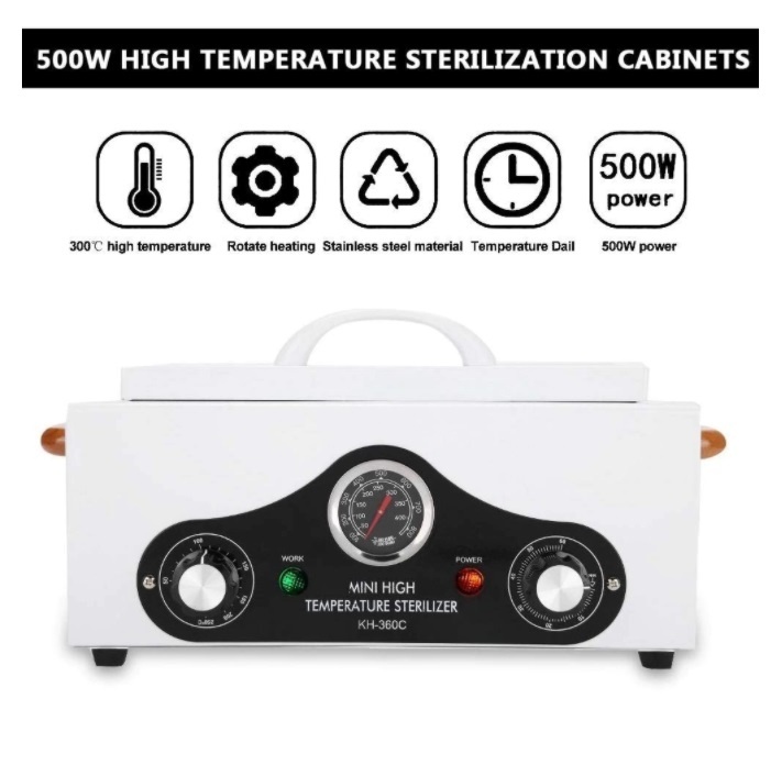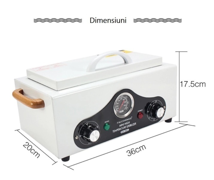 Pupinel Calibrat, Sterilizator Profesional cu Aer Cald 300 Grade Model Nou KH-360C Detalii Sterilizator Pupinel: Temperatura maxima 300 grade Celsius. Timer max 60 minute . Produs recomandat saloanelor de infrumusetare (manichiura, pedichiura, coafura, cosmetica, masaj, saloane de tatuaj, etc), cabinete infrumusetare canina, cabinete veterinare dar si cabinete medicale. Tavita este usor detasabila. Se poate extrage si apoi reintroduce imediat dupa sterilizare datorita inelelor de prindere detasabile. Sterilizatorul este inscriptionat CE, are certificat de conformitate si instructiuni in limba romana. Specificatii Sterilizator Pupinel: Masuri ( masina principal ) : 31 x 14 x 21 cm. Masuri ( interior ) : 25 x 12 x 5 cm. Masuri ( Tava ) : 24.3 x 11.3 x 2.7 cm. Volumul intern : 1.8 L. Timer: 60 minute reglabil. Temperatura: 20-300° C reglabil. Tensiune: 100V - 120V / 60Hz sau 220V - 240V / 50Hz. Putere: 500 W. Greutate bruta: 4.20 kg. Sterilizatorul cu aer cald este recomandat in diferite de domenii de activitate cu ar fi: manichiura/ pedichiura, coafura, cosmetica, saloane de tatuaj. Tavita interioara este usor detasabila. Se poate extrage si apoi reintroduce imediat dupa sterilizare datorita inelelor de prindere detasabile. Acest model de sterilizator pupinel vine insotit de: Factura , Manual de instrucțiuni in limba romană , Certificat de Conformitate CE , Sterilizatorul KH-360C este in conformitate cu prevederile Legii nr37/2002 privind protectia consumatorilor precum si ale Legii 78/2002 pentru modificarea si completarea Legii nr 178/2002 privind produsele cosmetice, publicata in Monitorul Oficial nr 582/06.08.2002.