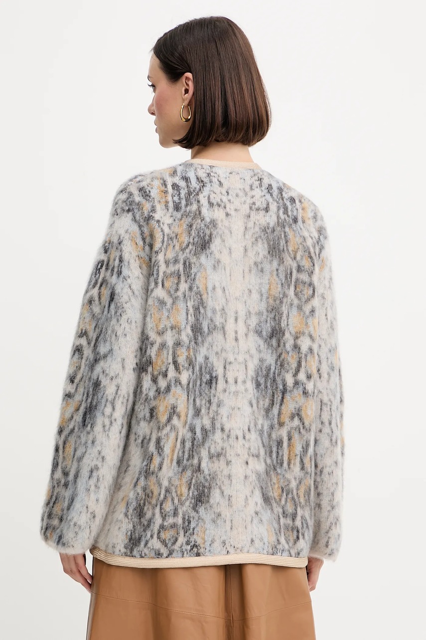 Palton scurt din colecția Forte Forte. Model neizolat confecționat din tricotaje cu model. Lâna, datorită proprietăților sale termoregulatoare ridicate, ajută la menținerea căldurii atunci când este frig și la răcire atunci când este cald.