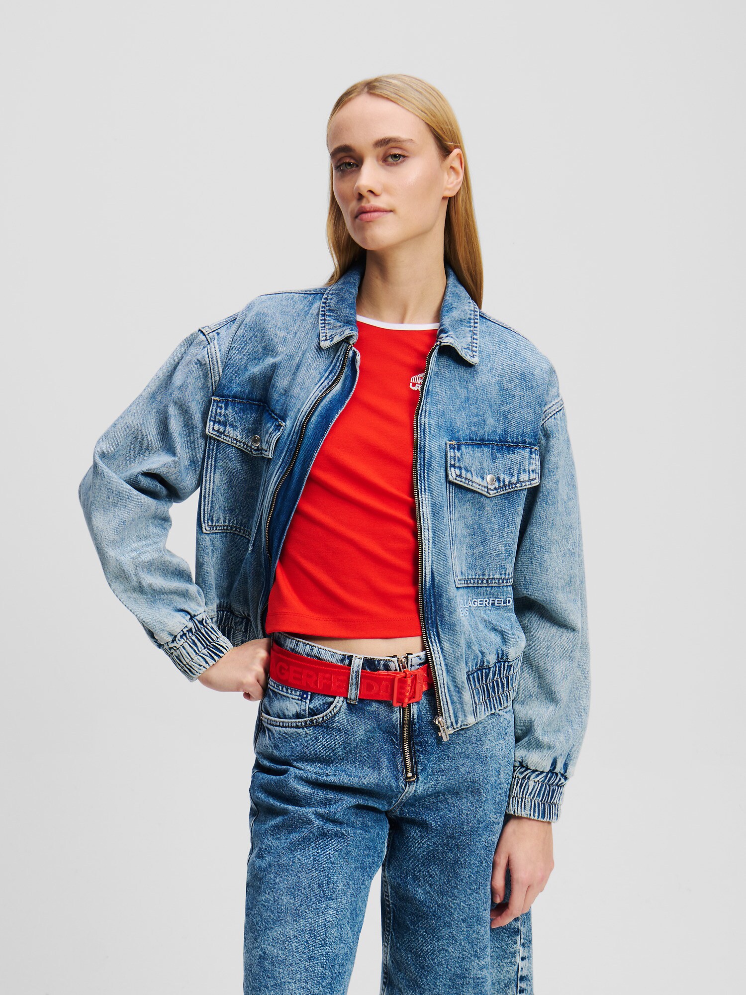 KARL LAGERFELD JEANS Geacă bomber din denim albastru, fermoar, buzunar la piept, logo brodat, fără căptușeală