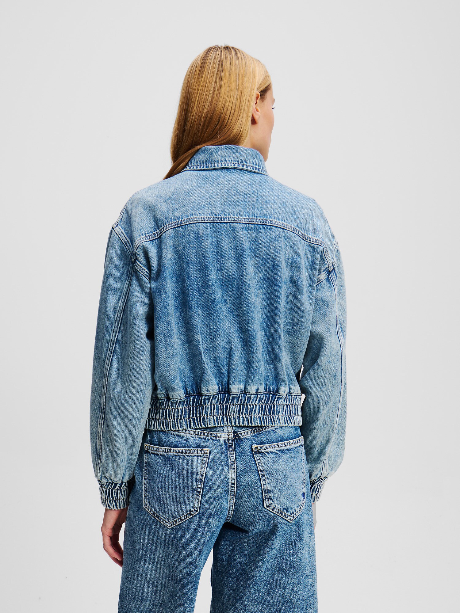 Design: Buzunar la piept; Tip de închidere: Fermoar; Modelul gecii: Geacă bomber; Căptușeală: Necăptușit; Material: Denim; Imprimeu: Monocrom; Detalii: Logo brodat, Efect prespălat; Croi: Croi normal