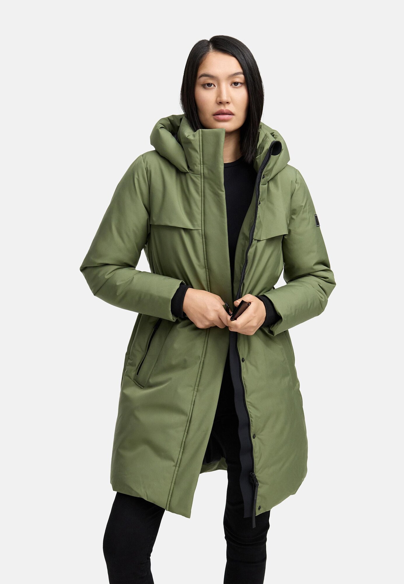 Design: Fentă cu capse, Guler tunică cu glugă, Manșete cu striații, Fermoar ascuns, Fermoar cu două căi, Buzunare laterale cu fermoar, Curea în talie; Tip de închidere: Fermoar; Căptușeală: Căptușit cald; Imprimeu: Monocrom; Detalii: Petic cu logo, Cusături ton în ton, Material neted, Material aderent, Găici pentru curea; Croi: Croi ce avantajează silueta; Lungime: Lungime normală
