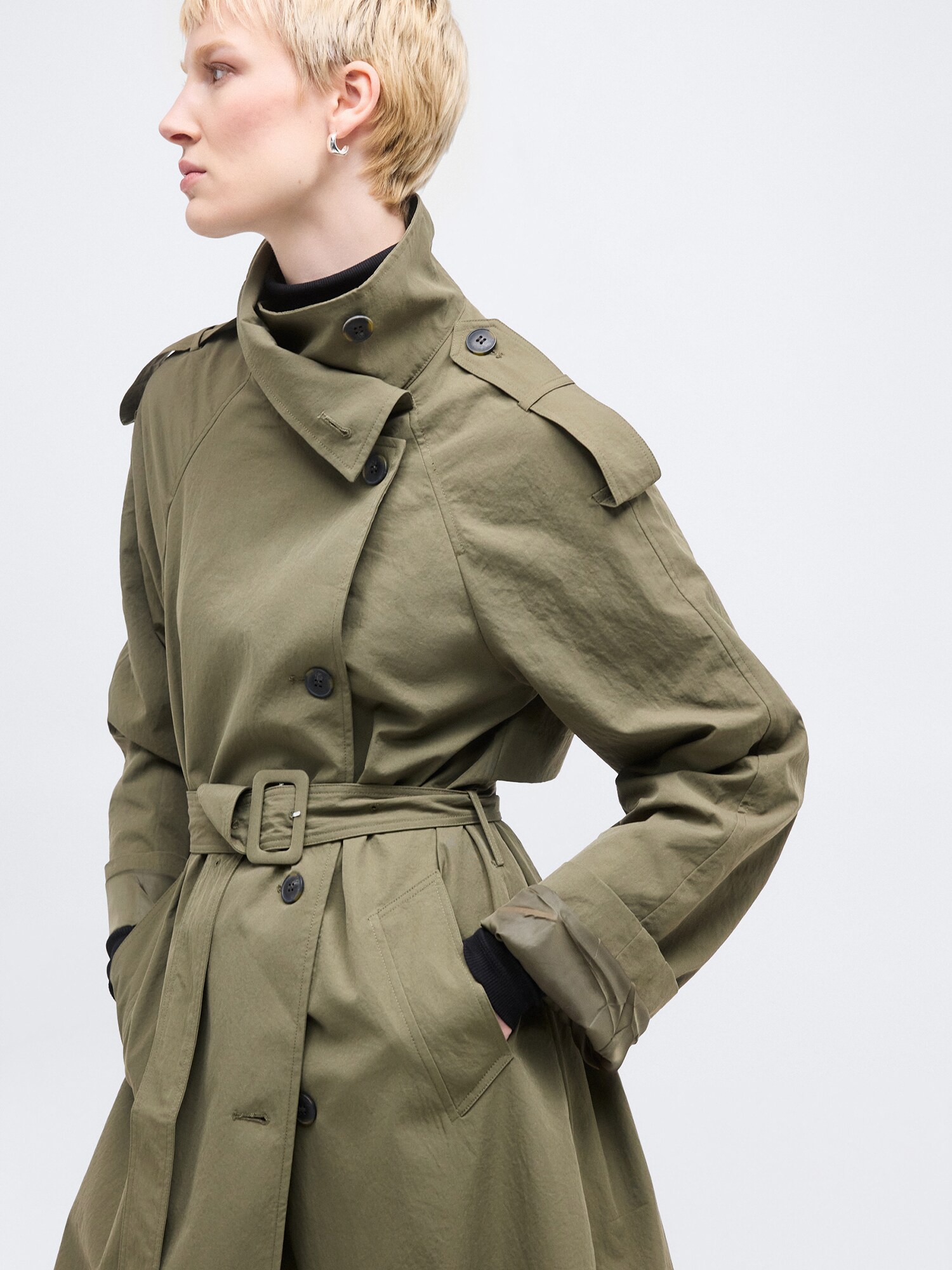 Modelul paltonului: Trenci; Design: Șliț la spate, Șir de nasturi, Guler tunică, Buzunare laterale deschise, Curea în talie; Tip de închidere: Închidere cu nasturi; Căptușeală: Căptușit parțial; Imprimeu: Monocrom; Detalii: Barete umeri, Găici pentru curea; Croi: Croi normal; Lungime: Lungime normală