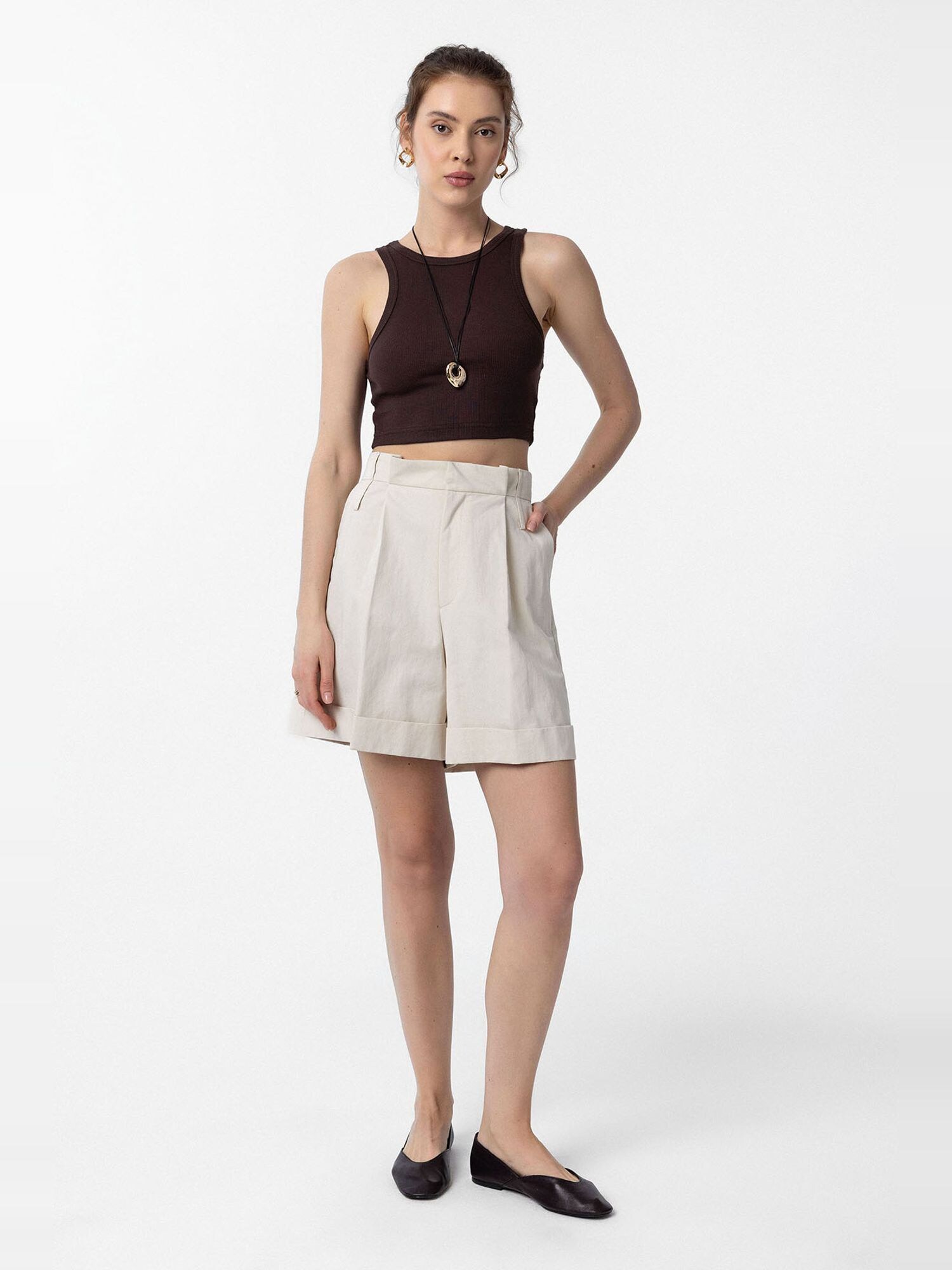 Design: Buzunare laterale deschise; Material: Bumbac; Imprimeu: Monocrom; Detalii: Pliuri; Detalii: Cusături ton în ton; Lungimea: Până la genunchi; Tipul croiului: Largi; Tipul taliei: High waist