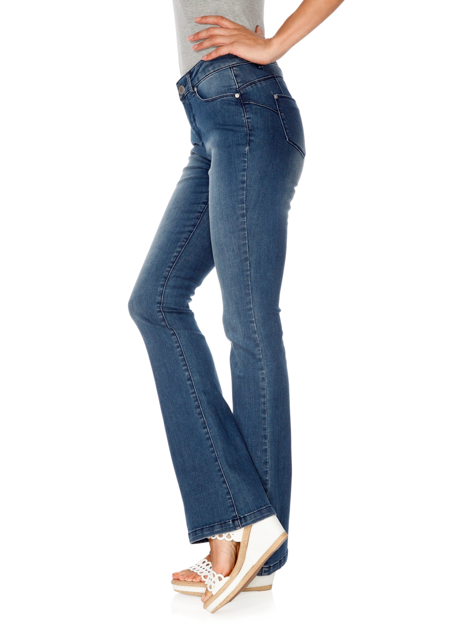 Design: Tiv/ margine tighelită, Închidere cu fermoar, Model cu 5 buzunare; Tip de închidere: Închidere cu nasturi; Material: Denim; Imprimeu: Monocrom; Detalii: Pietricele decorative, Găici pentru curea; Culoare: Heavy washed; Lungimea: Lung/maxi; Tipul croiului: Bootcut; Tipul taliei: Mid waist