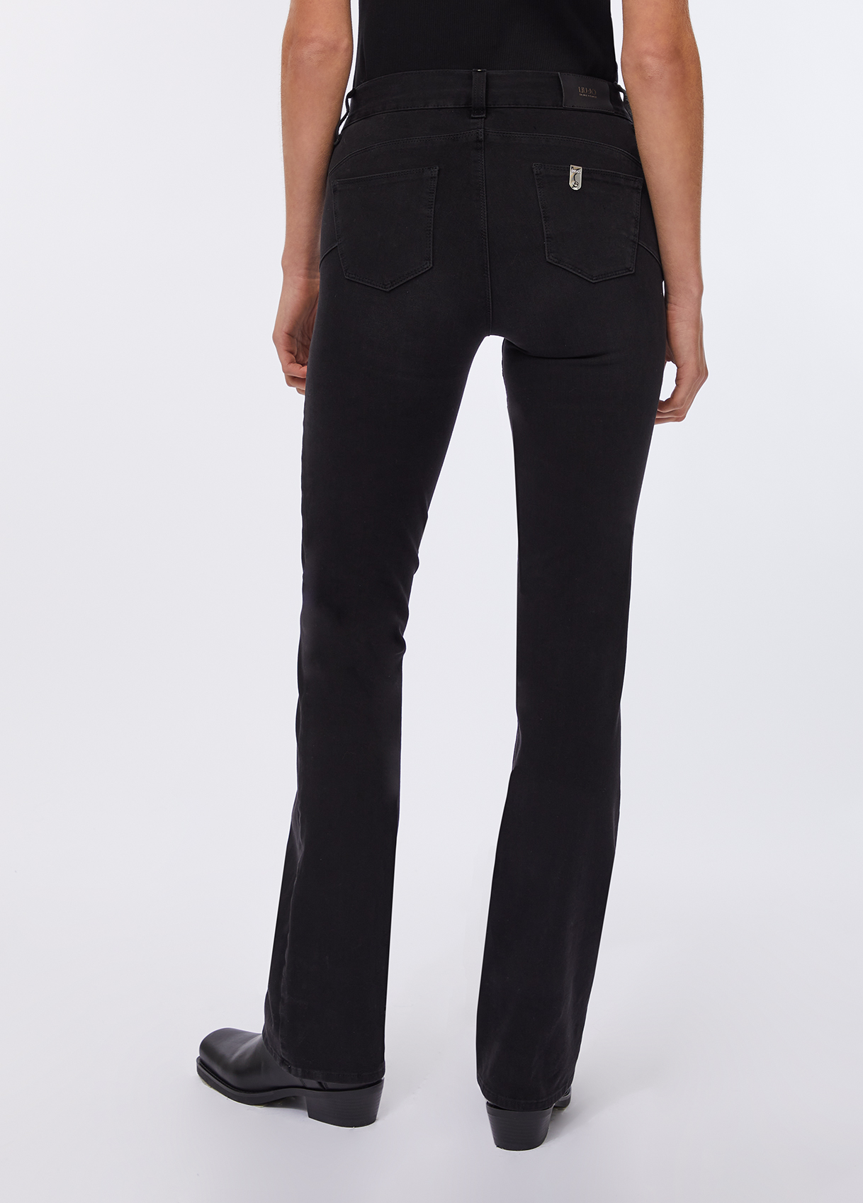 A fit that follows your movements and slims the silhouette. Denim crafted in Amazing Fit technology, enriched with elastane in both the warp and weft, conforms to your shape like a second skin without losing its form. Their bootcut cut enhances proportions and adds an elegant, casual allure, designed for any moment of the day. Black two-way stretch denim jeans Amazing Fit style Slimming and containing effect Guarantees a firm fit, use after use, especially on the knees and hips Light stone wash with scratches Bottom up cuts elegantly redefine curves, creating harmony and support without sacrificing comfort Five-pocket style High-rise Slightly flared leg Leg length: 85 cm Hem width: 21.5 cm
