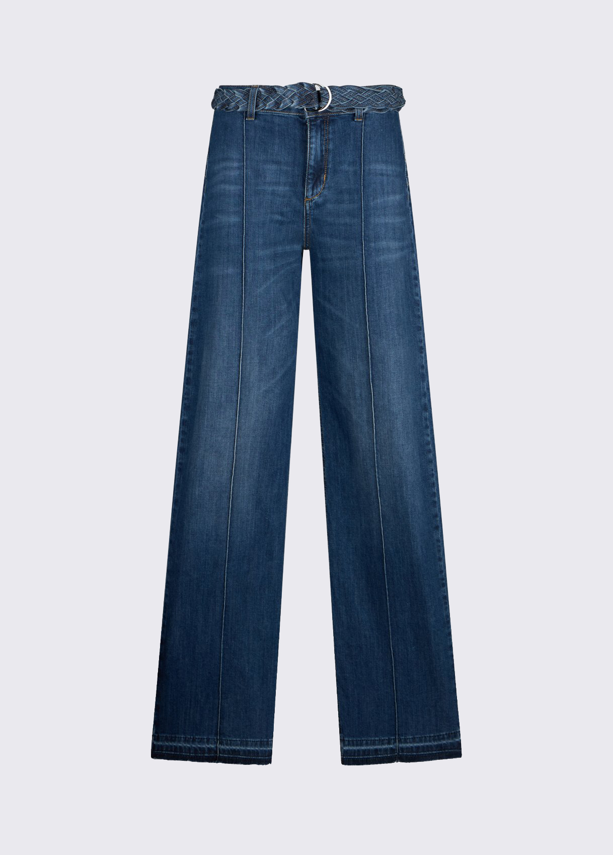 Stretch denim jeans Stonewash with scratches Bottom up cuts elegantly redefine curves, creating harmony and support without sacrificing comfort High-rise Handy pockets Tonal braided belt Flared leg Zip and button closure Leg length: 84 cm Hem width: 29.5 cm