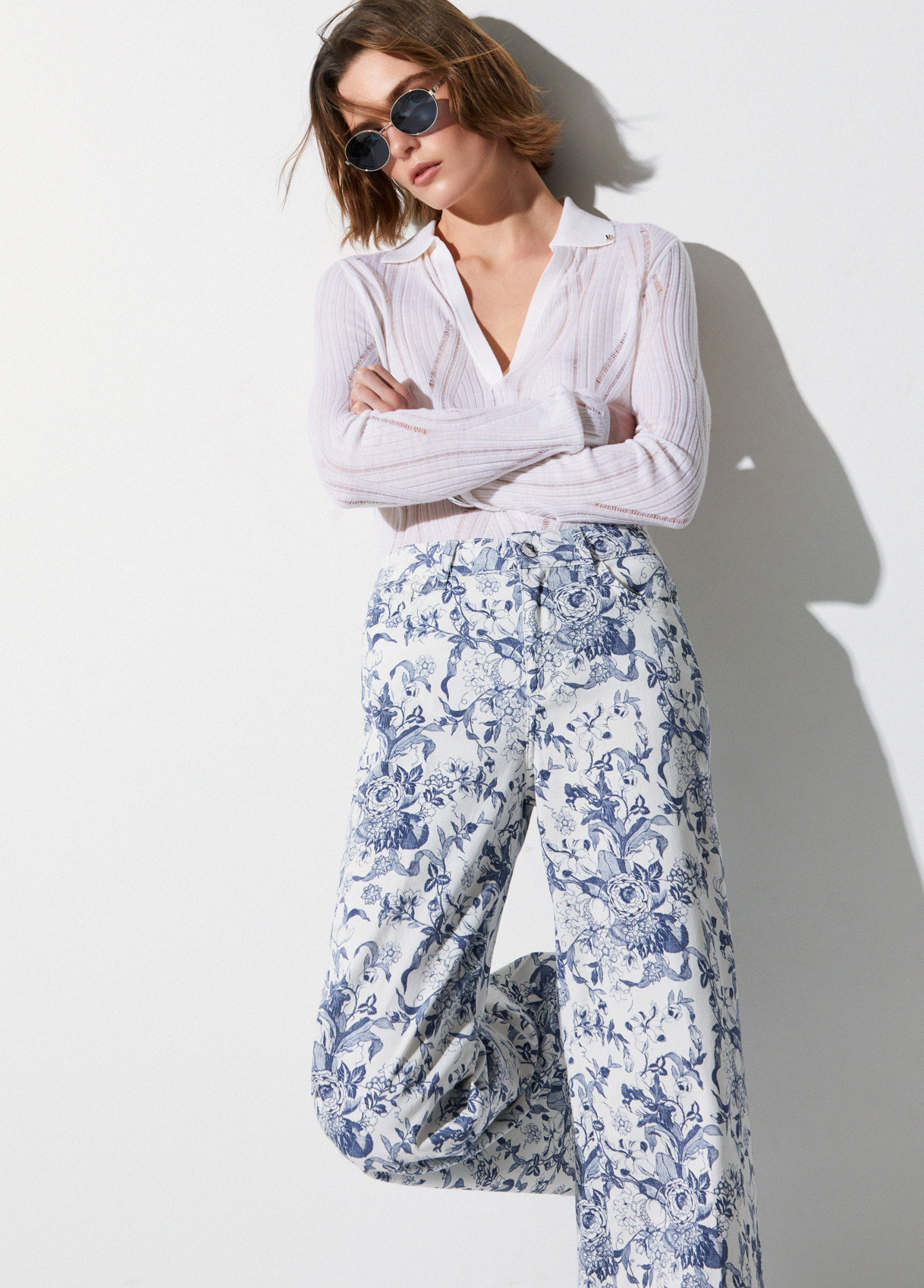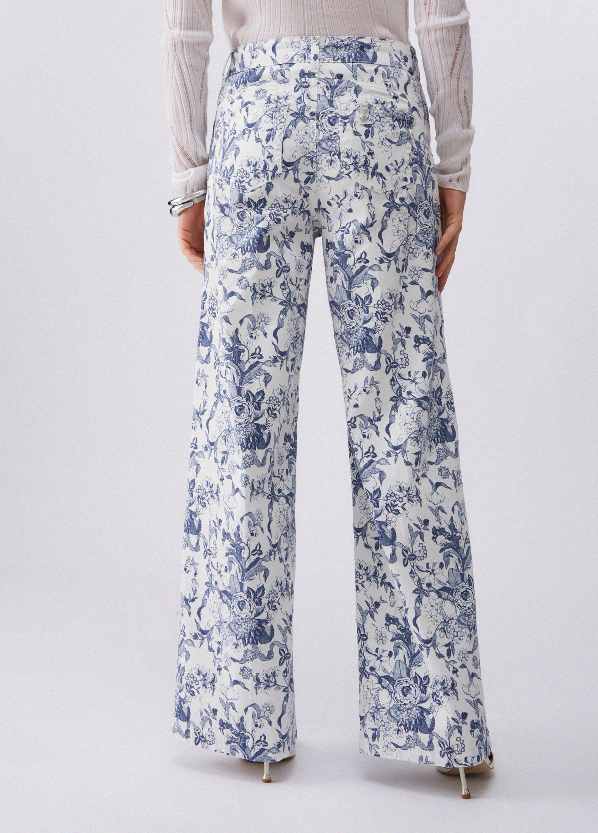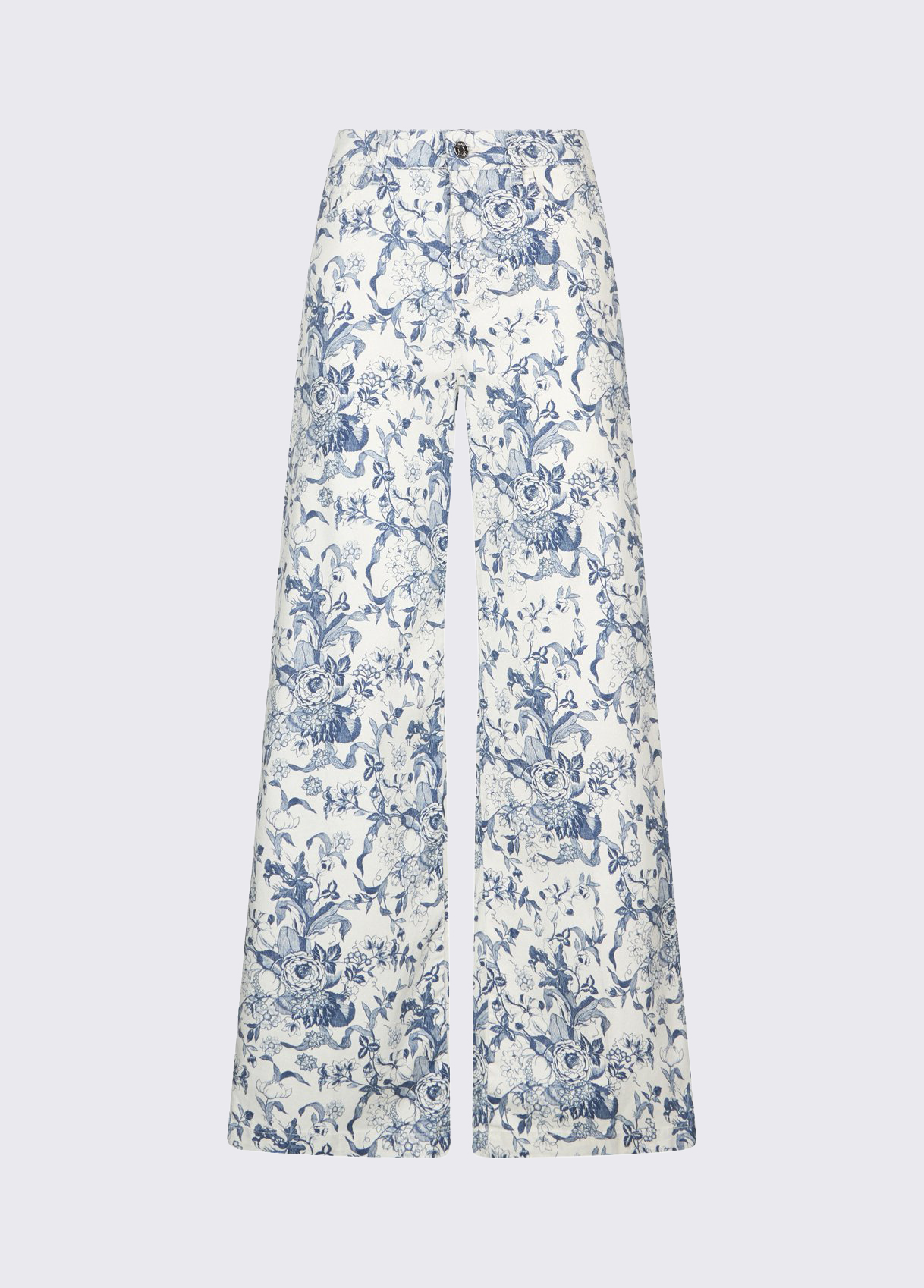 Pure cotton trousers All-over print High-rise Flared leg Handy pockets Zip and button closure Leg length: 86 cm Hem width: 31 cm