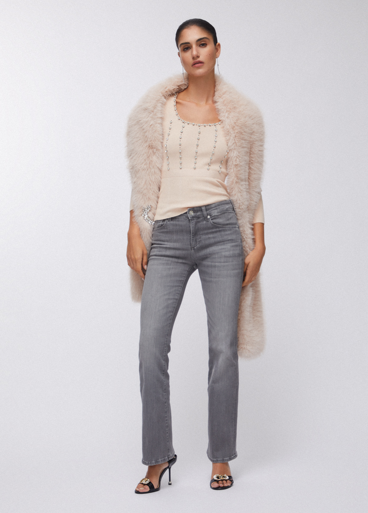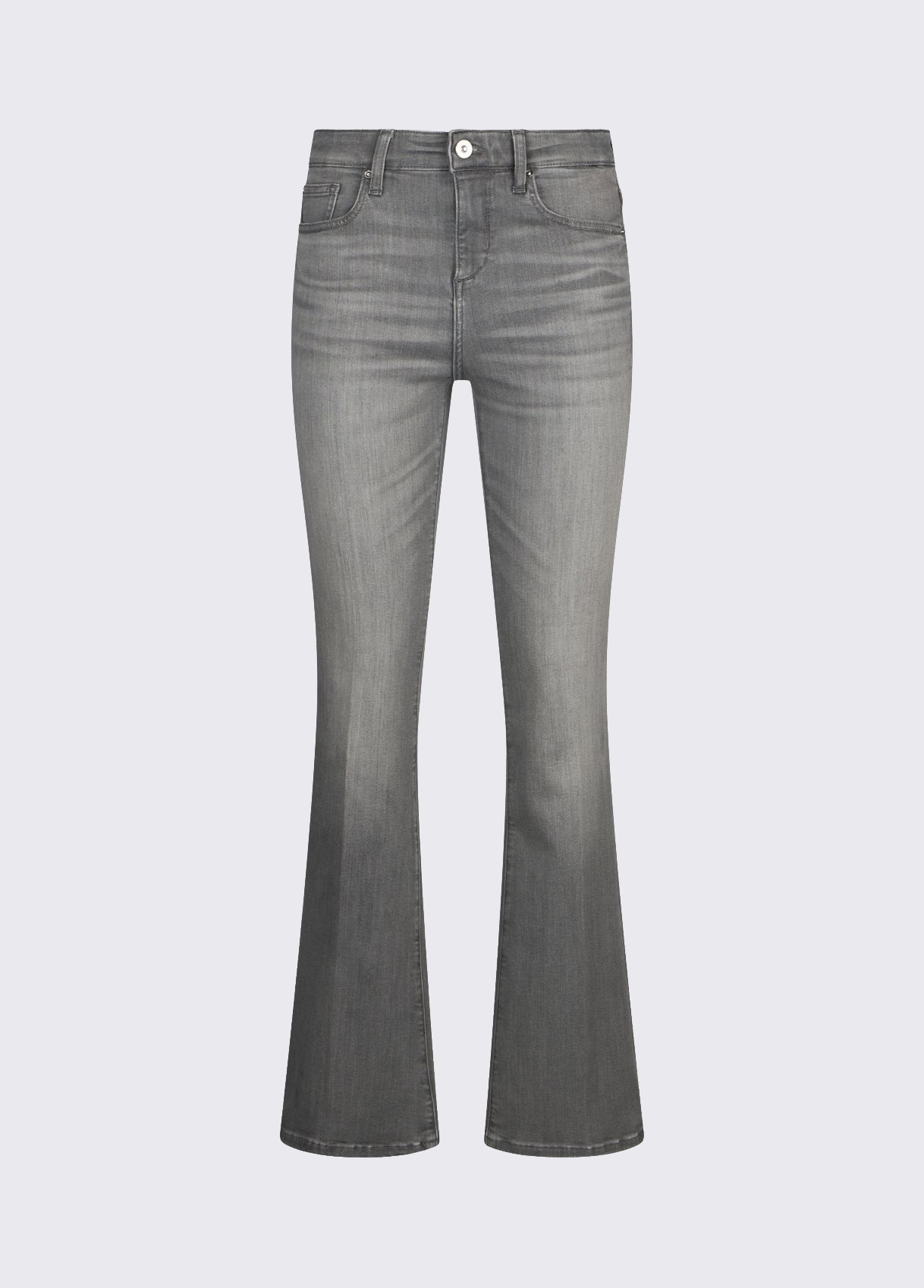 Stretch denim jeans Stone wash with smudges and tears Five-pocket model High-rise Gently flared leg Button and zip fastening Leg length: 82 cm Hem width: 25 cm