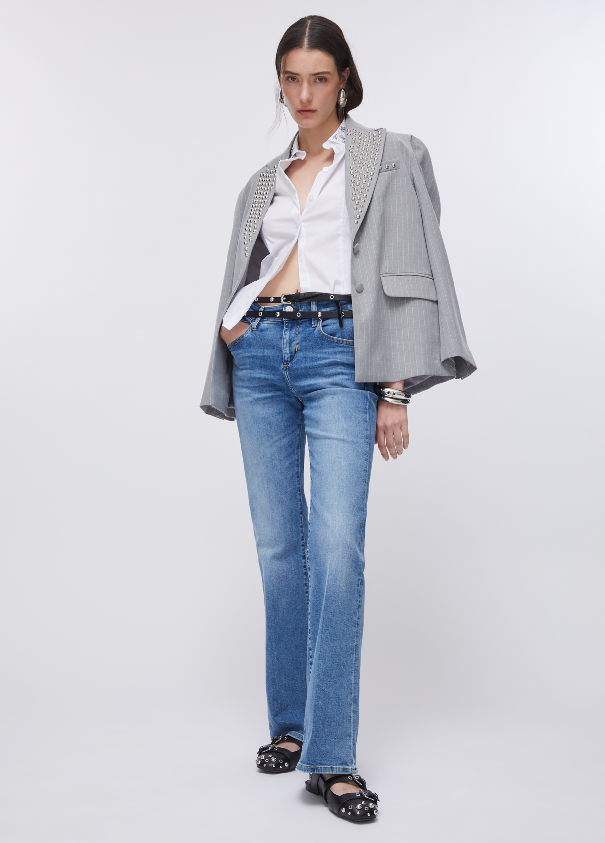 Stretch denim jeans Stone bleached wash with smudges and tears Five-pocket model High-rise Gently flared leg Button and zip fastening Leg length: 82 cm Hem width: 25 cm