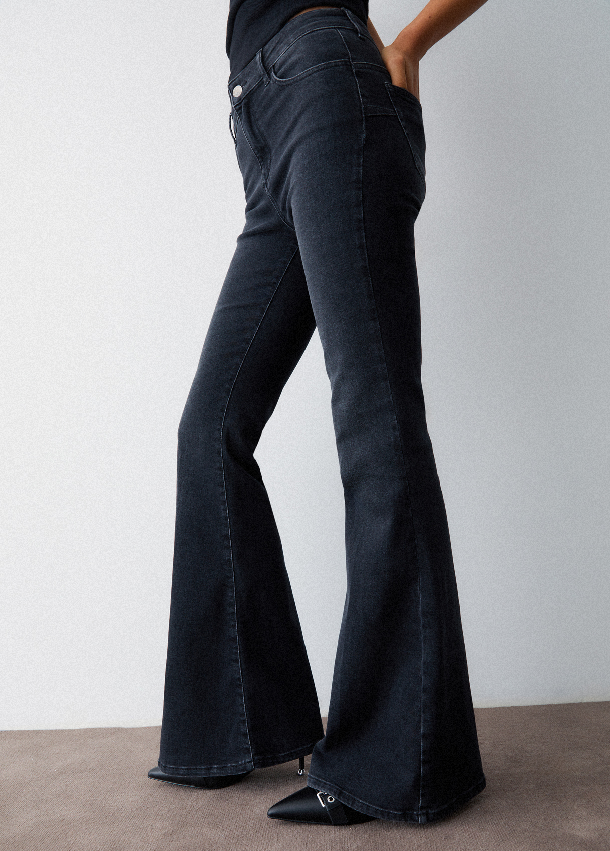 Stretch denim jeans Normal wash with whiskering and scratches Bottom up cuts elegantly redefine curves, creating harmony and support without sacrificing comfort Comfortable pockets High-rise Adjustable belt with monogram logo Slim leg on the thighs Bell-bottom hem Leg length: 86 cm Hem width: 33 cm