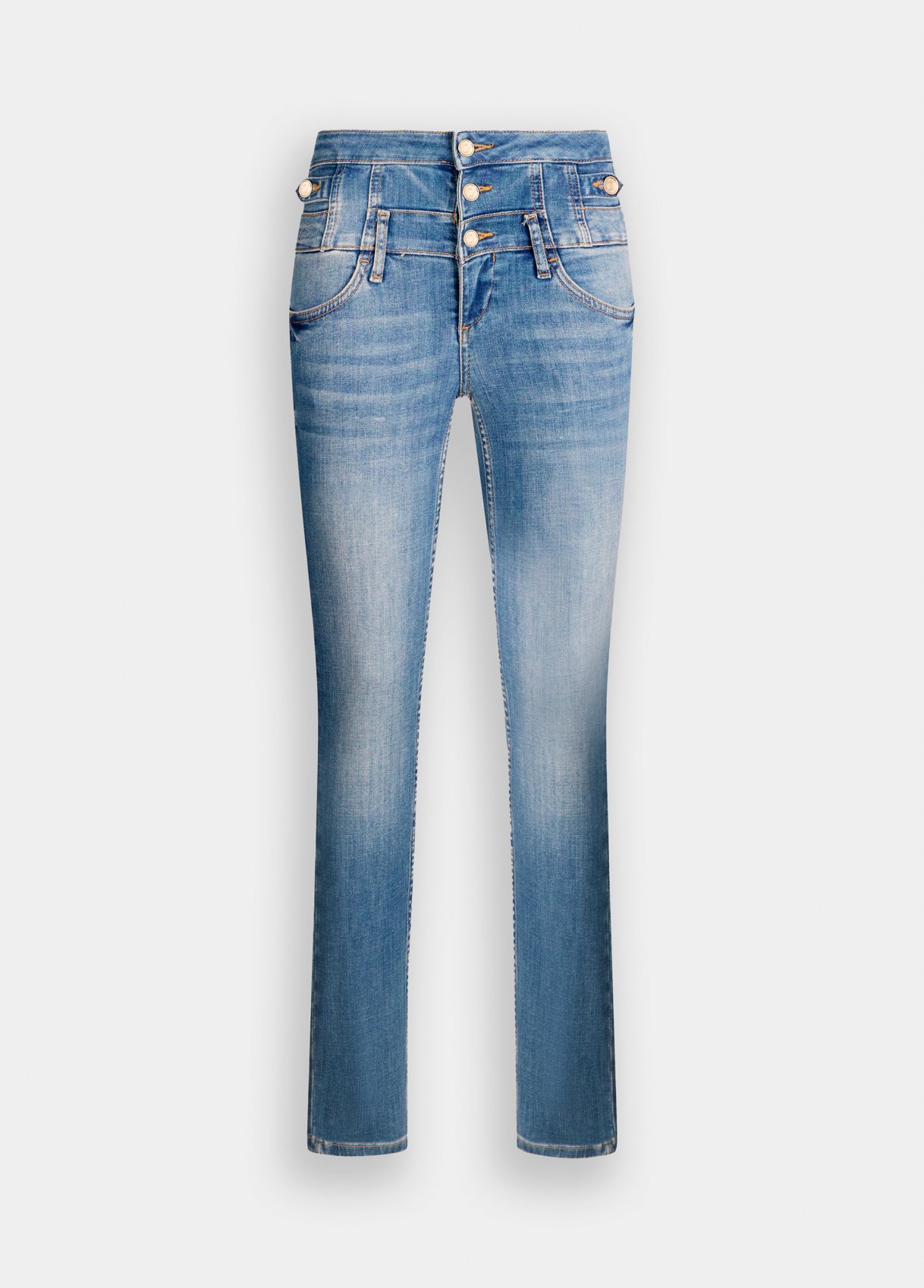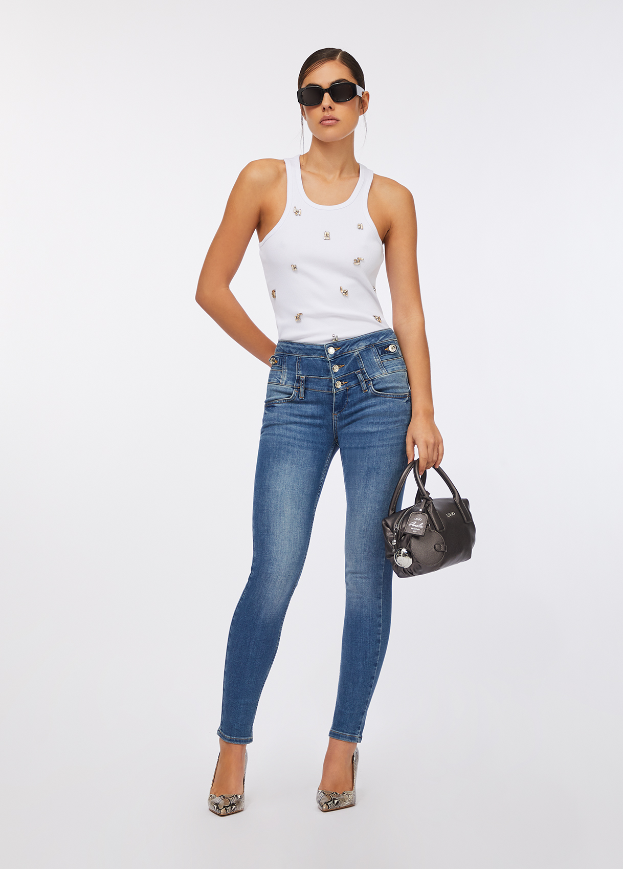 Stretch cotton blend denim jeans Bottom up cuts elegantly redefine curves, creating harmony and support without sacrificing comfort Worn wash Pressed pleat High-rise Skinny leg Five-pocket model Metal logo on the back Button closure Leg length: 76 cm Hem width: 14.5 cm