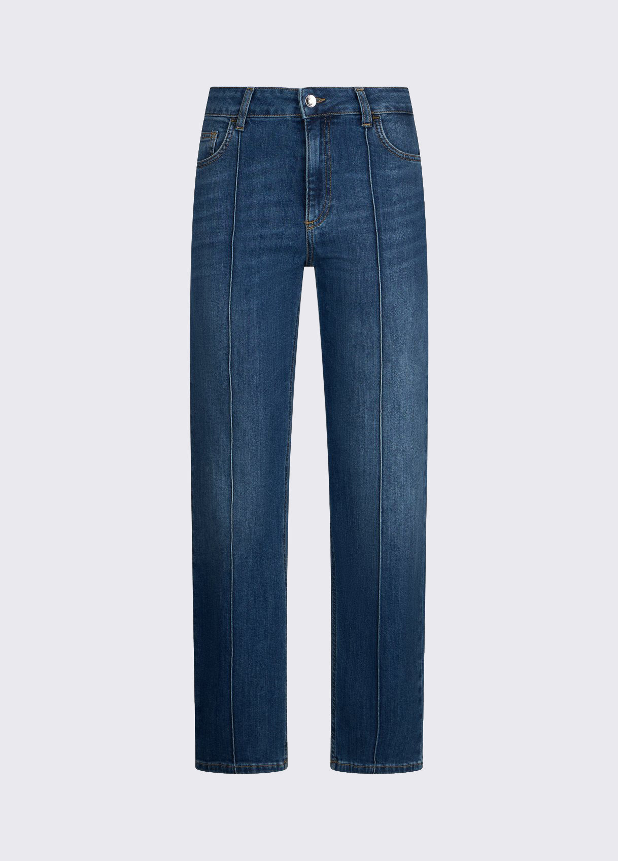 Stretch denim jeans Stonewash High-rise Handy pockets Straight leg Zip and button closure Leg length: 84 cm Hem width: 29.5 cm