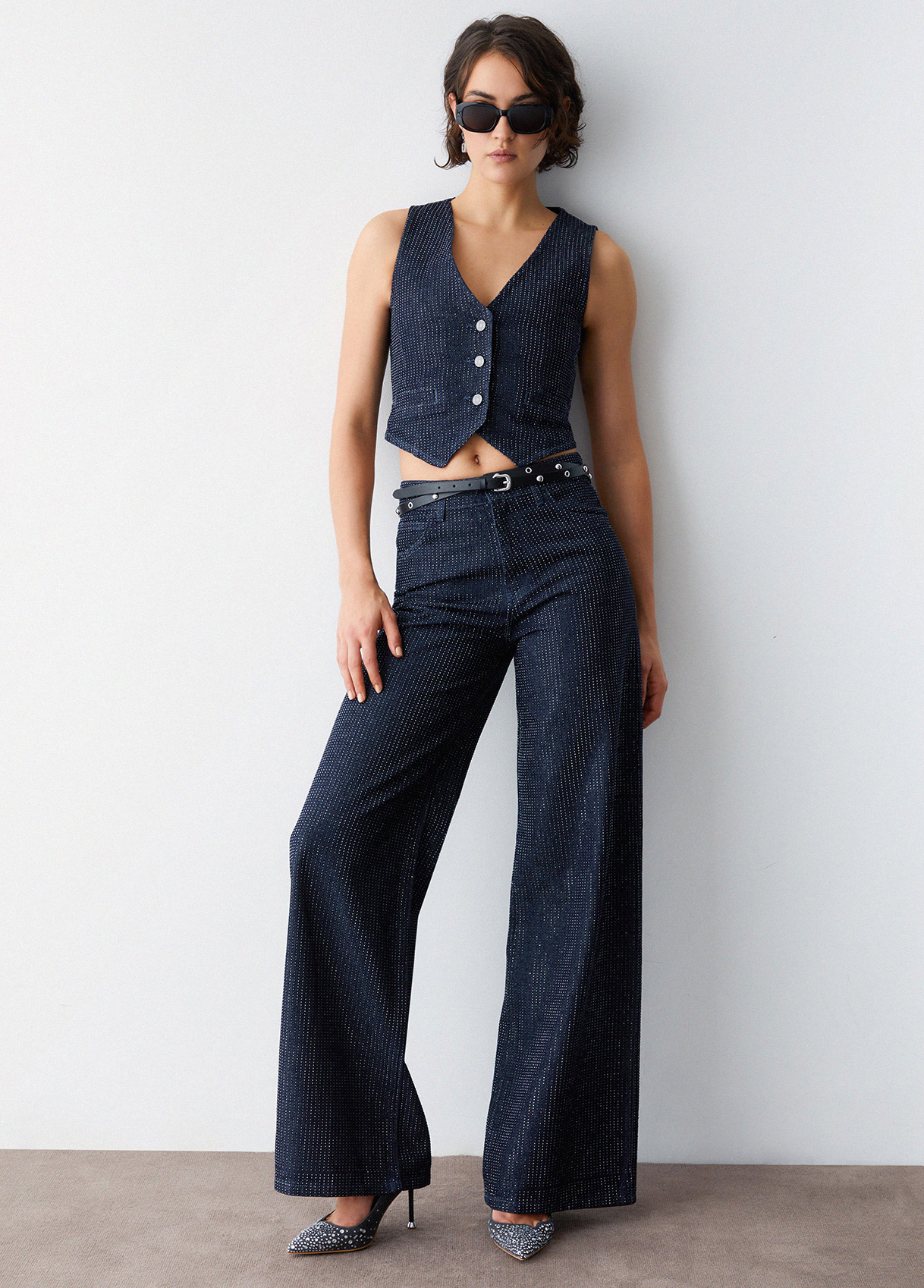 Denim jeans with all-over rhinestones High-rise Wide, straight leg Leather logo patch Handy pockets Zip and button closure