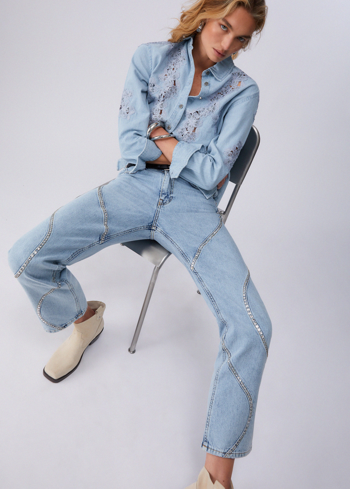 Non-stretch denim jeans Mid-rise waist Comfortable pockets Contrast stitching Straight leg Bejewelled embellishment Zip and button closure
