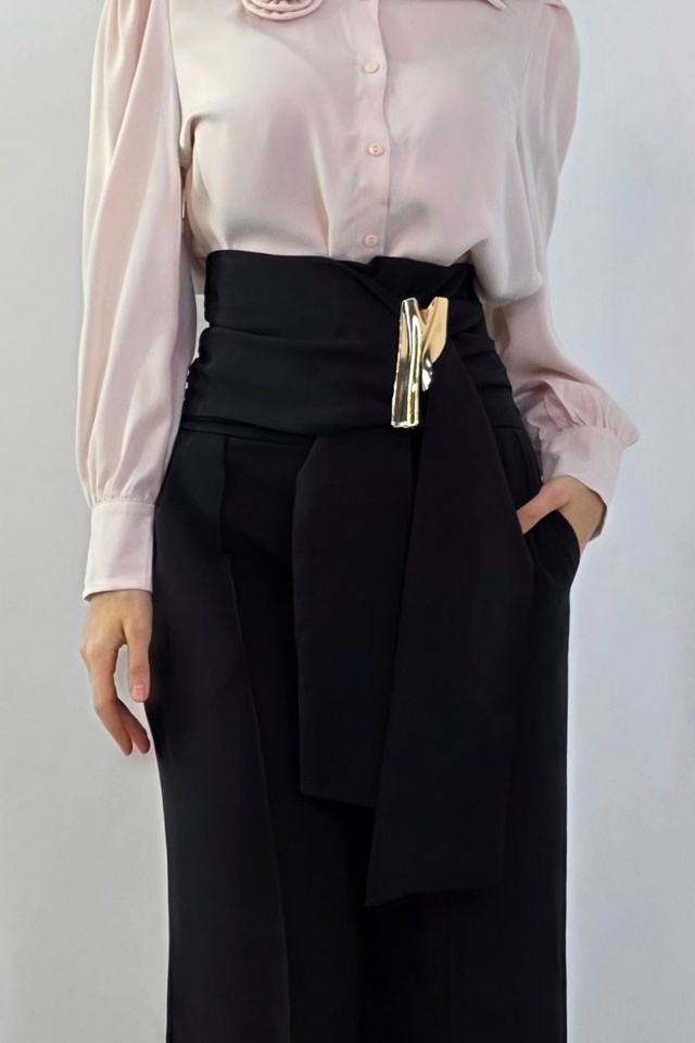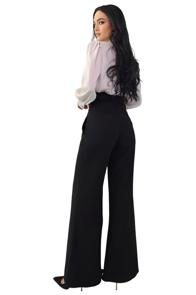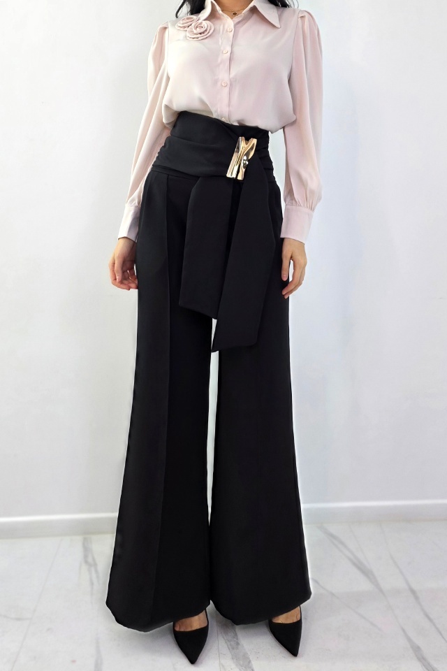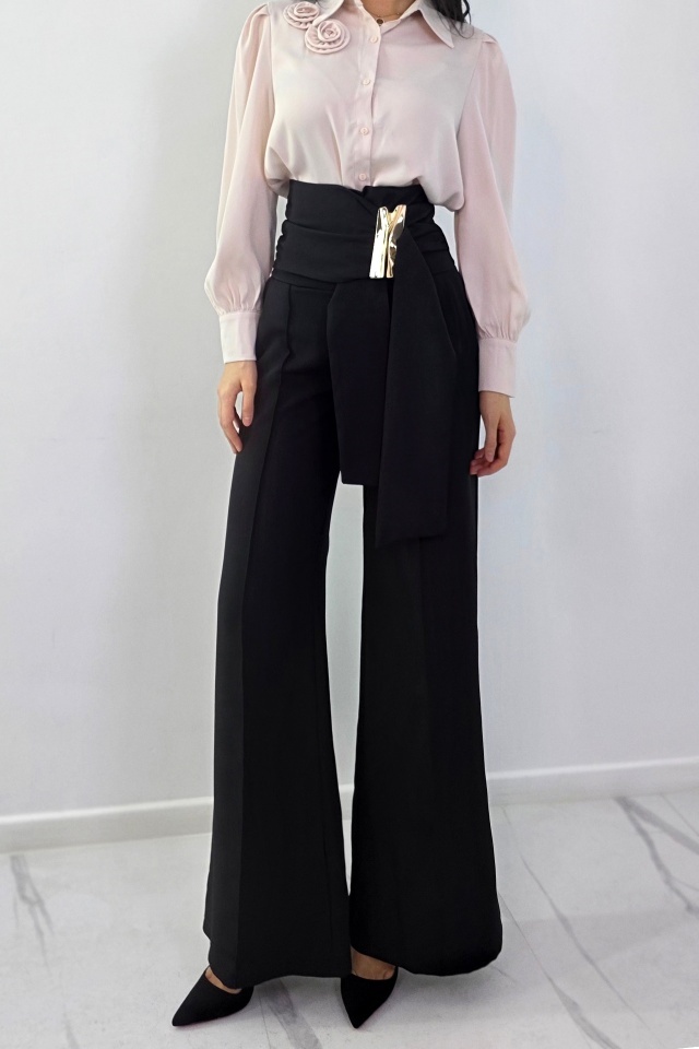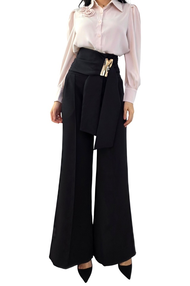 Pantalonii care iti schimba complet silueta. Croiala care alungeste si avantajeaza instant. Pantalonii palazzo sunt realizati din tesatura elastica vaporoasa, conceputa pentru a oferi confort la purtare si o cadere fluida, controlata. Materialul permite libertate de miscare si mentine un aspect neted si uniform pe intreaga lungime a piciorului. Croiala ampla tip palazzo este echilibrata de talia inalta, care contribuie la definirea siluetei si la alungirea vizuala a liniilor corpului. Inchiderea se face la spate, prin fermoar discret, pentru o fixare sigura si o estetica curata in partea frontala. Elementul distinctiv este reprezentat de esarfa decorativa pozitionata lateral, accesorizata cu un detaliu metalic, care adauga structura si accent vizual fara a incarca designul. Acest detaliu completeaza functional si estetic linia taliei, oferind produsului un aspect modern si bine echilibrat. Pantalonii sunt potriviti pentru tinute elegante, office sau smart casual, putand fi integrati usor in combinatii cu camasi, bluze fluide sau sacouri. Designul imbina functionalitatea cu atentia la detalii, rezultand un produs versatil, bine construit si usor de adaptat diferitelor contexte vestimentare. Caracteristici pantaloni: - croiala lunga evazata, wide leg, cu talie inalta si textura elastica - inchidere cu fermoar la spate - buzunare laterale, practice - esarfa decorativa in talie cu prindere metalica de tip cataram ă Compozitie material: 95% poliester, 5% elastan Sezon: all season (ideal primavara-toamna, adaptabil iarna) Ingrijire : Eticheta produsului conține informații esențiale referitoare la întreținerea și spălarea corectă a articolelor vestimentare. Imaginile Fashionforyou au caracter informativ, iar nuanta, tonul si intensitatea culorii pot varia in functie de monitor/ecran telefon.