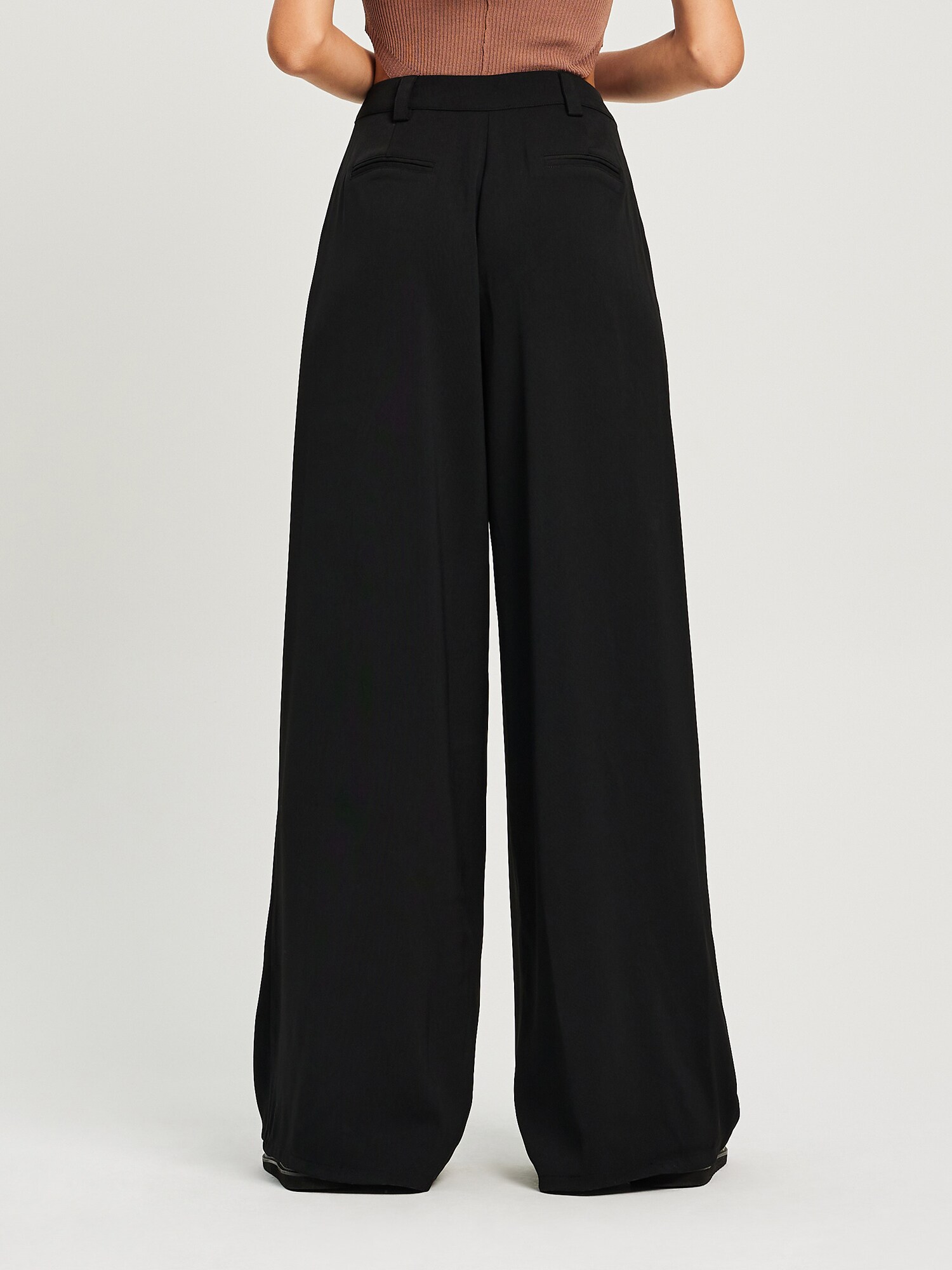 Design: Buzunare cu clapă/ cu laist, Buzunare laterale deschise; Tip de închidere: Fermoar; Imprimeu: Monocrom; Detalii: Pliuri; Detalii: Cusături ton în ton, Găici pentru curea; Lungimea: Lung/maxi; Tipul croiului: Wide leg; Tipul taliei: High waist
