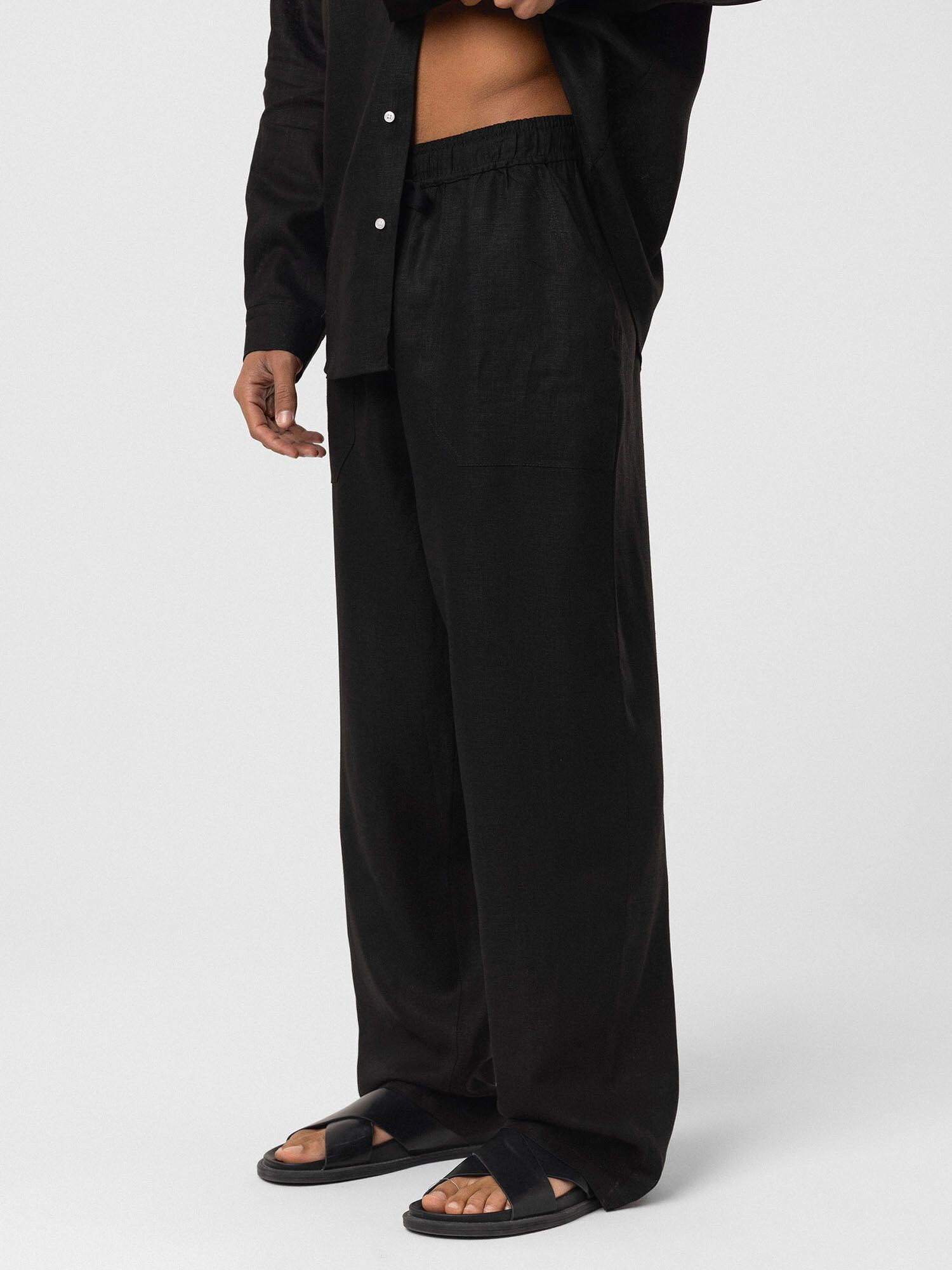 Design: Tiv/ margine tighelită, Betelie cu șiret, Tiv/ betelie elastică, Buzunare laterale deschise; Material: Bumbac; Imprimeu: Monocrom; Detalii: Cusături ton în ton, Material prietenos cu pielea; Lungimea: Lung/maxi; Tipul croiului: Wide leg
