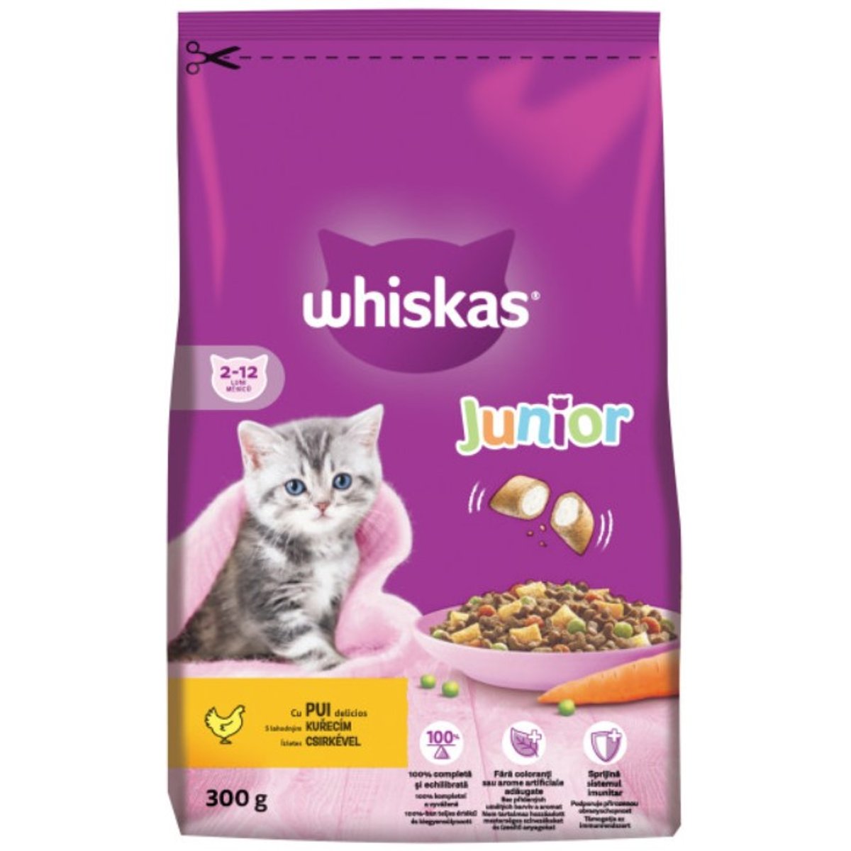 Whiskas Junior hrana uscata cu pui pentru pisici junioare 300gA se pastra inchis, la loc uscat si racoros.Temperatura camerei
