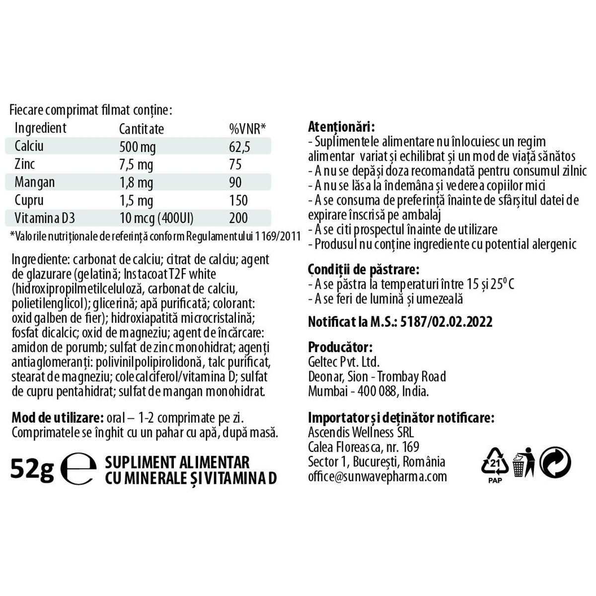 Componentele din SWP 4Bones Plus contribuie la: • coagularea normala a sangelui: calciu • functionarea normala a sistemului muscular: calciu, vitamina D • mentinerea sanatatii sistemului osos: calciu, mangan, vitamina D, zinc • mentinerea sanatatii dintilor: calciu, vitamina D • functionarea normala a sistemului nervos: cupru • formarea normala a tesuturilor conjunctive: mangan • protejarea celulelor impotriva stresului oxidativ: mangan, zinc, cupru • absorbtia/utilizarea normala a calciului si fosforului si mentinerea concentratiilor normale de calciu in sange: vitamina D • functionarea normala a sistemului imunitar: vitamina D, zinc, cupru • sinteza normala de ADN: zinc • mentinerea fertilitatii si reproducerii normale: zinc • mentinerea sanatatii parului, unghiilor, pielii: zinc • procesul de diviziune celulara: calciu, vitamina D, zinc Sursa de calciu in cazul unui aport alimentar redus sau a unei carente. Util pentru femei insarcinate, care alapteaza sau aflate la menopauza Mod de utilizare: oral – 1-2 comprimate pe zi. Comprimatele se inghit cu un pahar cu apa, dupa masa. Ingrediente: Fiecare comprimat filmat contine: Ingredient Cantitate Calciu - 500 mg Zinc - 7,5 mg Mangan - 1,8 mg Cupru - 1,5 mg Vitamina D3 - 10 mcg (400UI) Atentionari si precautii: •Suplimentele alimentare nu inlocuiesc o dieta variata si un stil de viata sanatos. •Nu depasiti doza zilnica recomandata. •Pastrati departe de copii. •Consumati inainte de data expirarii de pe ambalaj. •Contine ingrediente derivate din soia. •Doar pentru adulti, exclusiv barbati. •A se pastra la temperaturi intre 15 si 25 grade C •A se feri de lumina si umezeala