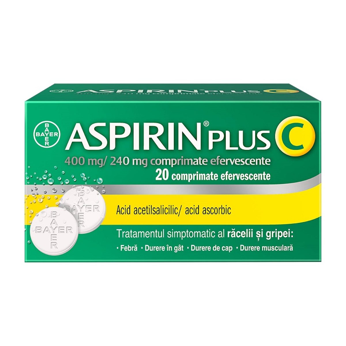 Compozitie Substantele active sunt acidul acetilsalicilic si acidul ascorbic. Fiecare comprimat efervescent contine acid acetilsalicilic 400 mg si acid ascorbic 240 mg. Celelalte componente sunt: citrat monosodic, hidrogenocarbonat de sodiu, carbonat de sodiu anhidru, acid citric anhidru. Indicatii terapeutice Aspirin Plus C comprimate efervescente este eficient in tratamentul simptomatic al durerii in gat, durerii si febrei asociate cu racelile, durerilor de cap, durerilor musculare si articulare, durerilor de spate, durerilor articulare minore, durerilor de dinti. Aspirin Plus C comprimate efervescente intareste mecanismele de aparare ale organismului si te poate ajuta sa iti revii rapid. Aspirin Plus C comprimate efervescente contine si acid ascorbic (240mg), cunoscut in mod obisnuit ca vitamina C, in plus fata de continutul de acid acetilsalicilic (400 mg), care este o terapie eficienta pentru durere si febra si, de asemenea, un antiinflamator. Forma sa de comprimat efervescent transforma Aspirin Plus C comprimate efervescente intr-un medicament reconfortant si usor de luat. Doze si mod de administrare Adulti si adolescenti( cu varsta peste 12 ani ): Pentru efectul analgezic si antipiretic se administreaza 1-2 comprimate efervescente de Aspirin Plus C comprimate efervescente, repetand in functie de necesitati la intervale de 4-8 ore, fara sa se depaseasca doza zilnica maxima de 4000 mg acid acetilsalicilic (8 comprimate efervescente). Se recomanda a nu se depasi doza de 1 g acid ascorbic pe zi, timp indelungat. Contine 933 mg sodiu pe un comprimat efervescent, fapt ce trebuie luat in considerare de catre pacientii cu dieta hiposodata. Comprimatele efervescente se dizolva intr-un pahar cu apa inainte de administrare. Precautii Nu luati ASPIRIN PLUS C Daca sunteti alergic la acidul acetilsalicilic sau la alte antiinflamatoare nesteroidiene sau oricare dintre componentele acestui medicament Daca aveti ulcer gastric sau duodenal activ; Daca aveti tendinta de sangerare crescuta (diateza hemoragica); Daca aveti antecedente de astm bronsic indus de administrarea salicilatilor sau a substantelor cu actiune similara, in special antiinflamatoare nesteroidiene; Atentionari speciale Sarcina, alaptare, fertilitate In primul si al doilea trimestru de sarcina trebuie sa cereti sfatul medicului dumneavoastra inainte de a lua acest medicament sau alte medicamente care contin acid acetilsalicilic. ASPIRIN PLUS C nu trebuie utilizat in ultimul trimestru de sarcina, datorita riscului crescut al complicatiilor pentru mama si fat in timpul nasterii. Mici cantitati de acid acetilsalicilic si de metaboliti ai sai trec in laptele matern. Deoarece nu s-au raportat efecte nocive asupra sugarilor, in general, nu este necesar sa se opreasca alaptarea in cazul utilizarii medicamentului pe termen redus, la dozele recomandate pentru dureri sau febra. Totusi, daca utilizarea pe termen lung si/sau in doze mari (mai mult de 6 comprimate efervescente pe zi) a fost prescrisa in cazuri izolate, pacienta trebuie sa intrerupa alaptarea. Conducerea vehiculelor si folosirea utilajelor Nu are nicio influenta asupra capacitatii de a conduce vehicule sau de a folosi utilaje. Ambalaj Cutie cu 10 plicuri multistratificate din hartie/PE/Al/surlin a cate 2 comprimate efervescente. Pagina actualizata la data de: 09.06.2021