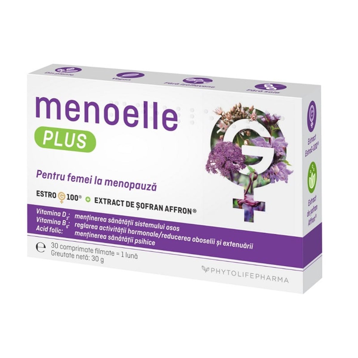 Proprietati: Cu un pas inaintea menopauzei menoelle® PLUS este un supliment alimentar potrivit femeilor de peste 40 de ani, inca de la primele simptome de menopauza. menoelle® PLUS are o formula bazata pe abordarea holistica coreeana a extractului brevetat EstroG-100© ( extract de radacina uscata a 3 ierburi medicinale: Cynanchum wilfordii, Phlomis umbrosa si Angelica gigas) in controlarea celor mai frecvente 12 simptome asociate menopauzei: bufeuri, parestezii (amorteala), insomnie, nervozitate, depresie, ameteala, oboseala, dureri articulare, dureri de cap, aritmii (palpitatii), furnicaturi si uscaciune vaginala, precum si densitatea minerala osoasa. Eficacitatea extractului coreean este potentata de extractul de sofran Affron®, provenit din culturi europene, brevetat, foarte concentrat, cu eficacitate in diminuarea simptomelor precum schimbarile de dispozitie, anxietate, nervozitate si insomnie si de cele 3 vitamine: vitamina B6, vitamina D3 si acid folic. Mod de administrare: Pe cale orala: - 1 comprimat filmat/zi, dimineata, cu o cantitate suficienta de apa. Se recomanda administrarea pe o perioada de minim 3 luni. Pentru eficacitate de durata, se recomanda administrarea pe termen lung. - 1 cutie asigura tratamentul pentru o luna. Ingrediente active/1 comprimat: Extract EstroG-100 din radacini uscate de Cynanchum wilfordii, Phlomis umbrosa si Angelica gigas 175 mg Extract de Dofran Affron 14 mg Vitamina D3 5 mcg Vitamina B6 0.21 mg Acid Folic 30 mcg Precautii: Nu este recomandat copiilor, femeilor insarcinate sau care alapteaza si nici persoanelor cu alergice la plante din Fam. Apiaceae/Umberlliferae. A nu se depasi doza zilnica recomandata. Suplimentele alimentare nu inlocuiesc o dieta variata si echilibrata. Prezentare: 30 comprimate