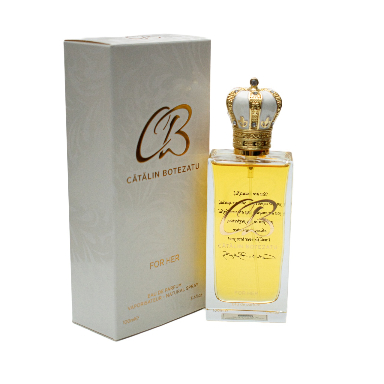 Parfum Catalin Botezatu, pentru Ea - 100ml Acest parfum este o declarație de feminitate totală, o esență creată pentru femeia care nu trece niciodată neobservată. O aromă ce combină delicatețea, strălucirea și magnetismul într-un mod irezistibil, transformând fiecare apariție într-un moment memorabil. Parfumul se deschide cu o prospețime luminoasă de strugure și frezie, un duo care oferă energie, puritate și o notă jucăușă încă de la primul puf. Este o intrare vibrantă, feminină și plină de viață. Inima parfumului este construită pe un buchet floral elegant: bujor catifelat, mandarină cu tonuri fructate și iasomie seducătoare. Aceste note creează o alchimie rafinată, floral-fructată, care te învăluie într-o aură de senzualitate naturală. Baza este caldă, catifelată și extrem de feminină, compusă din mosc alb, miere și note pudrate. Această combinație oferă un finisaj dulce, delicat și persistent, transformând parfumul într-o semnătură olfactivă cu adevărat inconfundabilă. Parfumul Cătălin Botezatu este creat pentru femeile care știu să cucerească prin prezență, nu prin efort. Este parfumul reginei moderne — elegante, asumate și pline de farmec — un elixir al senzualității care pune în evidență frumusețea fiecărei clipite. Note de vârf: strugure, frezie Note de mijloc: bujor, mandarină, iasomie Note de bază: mosc alb, miere, note pudrate