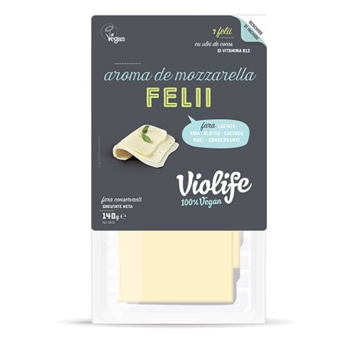 VIOLIFE este o gama de produse premiate, care sustine cu ușurința implicarea sau trecerea la o dieta fara lactate. Nu contine lactoza sau gluten, cu continut mic de colesterol , fara conservanți, cazeina, zer, gluten, oua, soia sau nuci. Produs bazat pe ulei de nuca de cocos și imbogatit cu vitamina B12, vitamina ce joaca un rol important în metabolismul fiecarei celule din corpul nostru. VIOLIFE FELII CU AROMA DE MOZZAREA, o data încercat, cu siguranta indragit pentru totdeauna. Cine nu iubește textura sa usor elastica și gustul inconfundabil ?!Ei bine, asta am recreat aici, într-un mod 100% vegan, desigur. Încearca-l pe biscuiți cu un pahar de vin roșu sau la gratar pe pâinea ta preferata, pe pastele dvs. ori chiar în salata dvs. Îți va placea gustul moale de unt. O sa îl manânci direct din pachet! 2-8 C