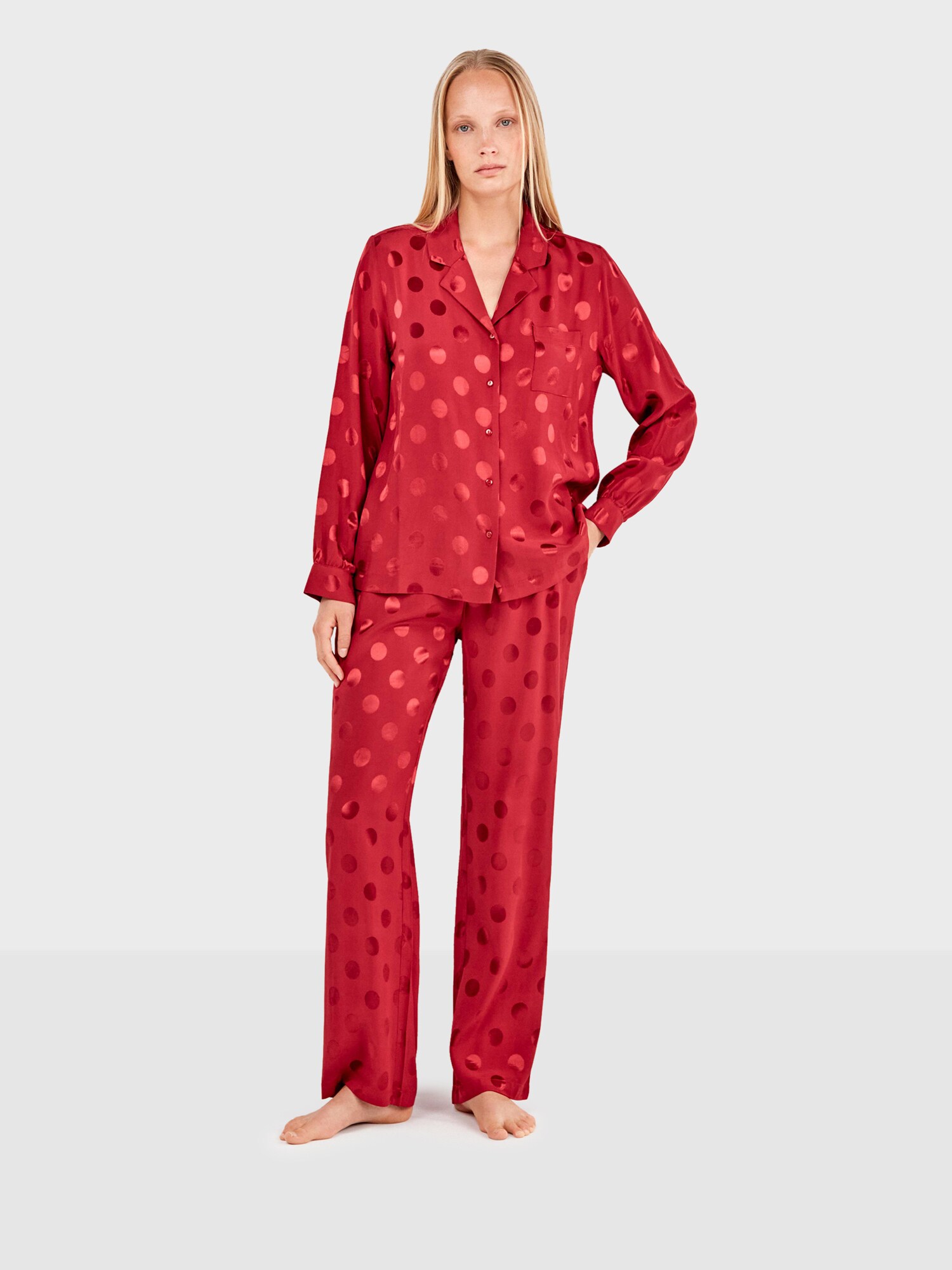 Design: Șir de nasturi, Guler rever, Buzunar la piept; Material: Viscoză; Imprimeu: Cu buline; Detalii: Pliuri; Detalii: Material ușor; Piese per set: 2 piese