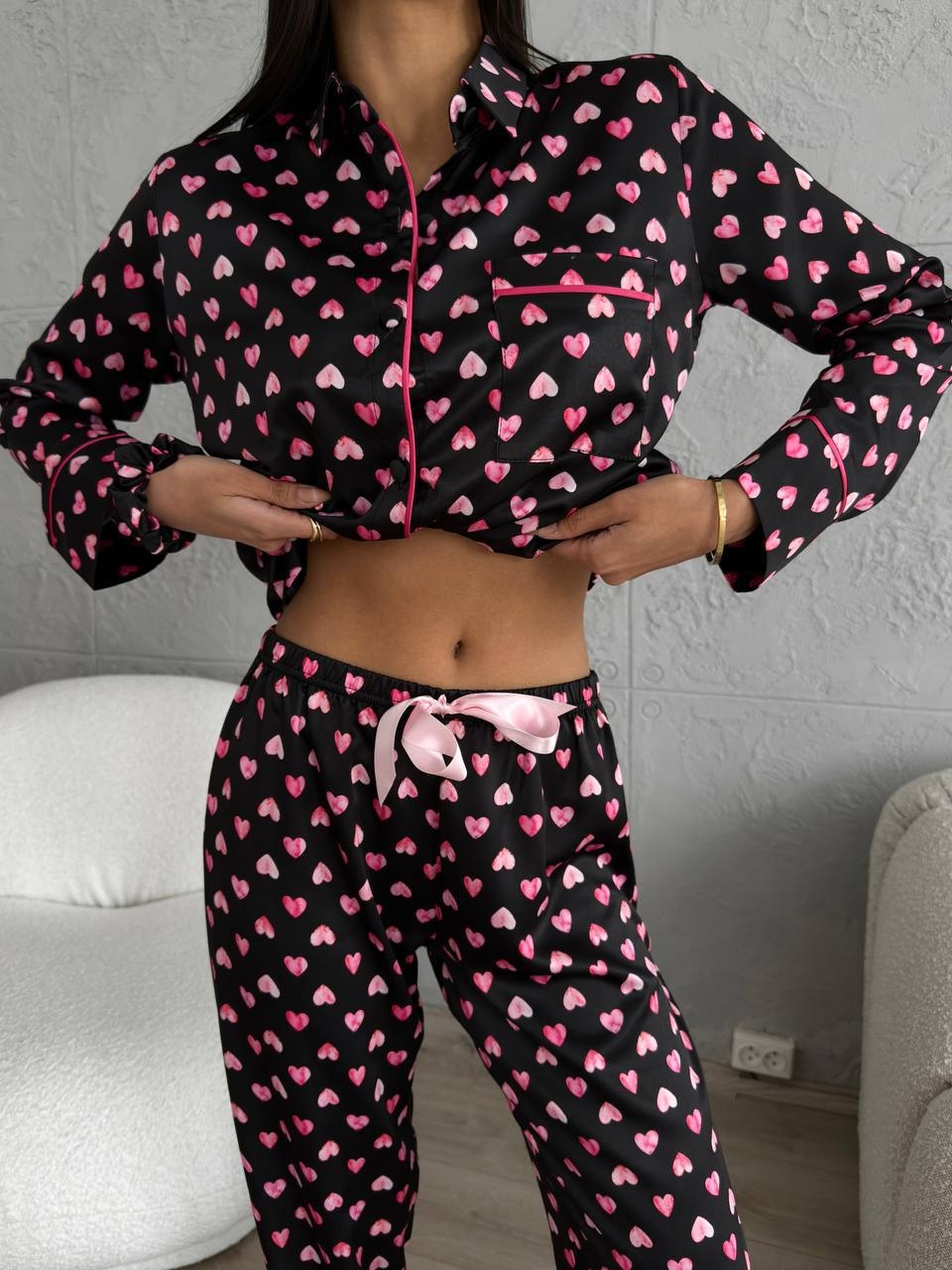Pijama damă din două piese , realizată din poliester de calitate, cu aspect de satin mat , ideală pentru confort și libertate de mișcare. Materialul are o textură fină, plăcută la atingere, oferind un look elegant și modern, perfect atât pentru somn, cât și pentru momentele de relaxare acasă. Setul este compus din bluză cu închidere frontală cu nasturi , guler clasic și buzunar aplicat, completată de pantaloni lungi cu croi lejer. Datorită proprietăților stretch, pijamaua se așază armonios pe corp, fără a crea disconfort. Deoarece are o croială lejeră, comandă mărimea exactă. Designul simplu, este ușor de integrat în garderoba de casă și potrivit pentru toate sezoanele. Detalii produs: Tip produs: Pijama damă Set: 2 piese + elastic pentru par Închidere: Nasturi Material: 95% Poliester, 5% Elastan Aspect material: Satin mat, stretch Croi: Lejer Lungime pantaloni: Lungă Instrucțiuni de întreținere: Spălare la maximum 30°C Program delicat / rufe sintetice Nu se înălbește Nu se usucă în uscător Țara de origine: Turcia Important : Culoarea produsului poate varia ușor datorită luminozității monitorului. Din cauza varietății instrumentelor de măsură, pot exista ușoare erori de cm, informațiile de mai sus sunt aproximative.