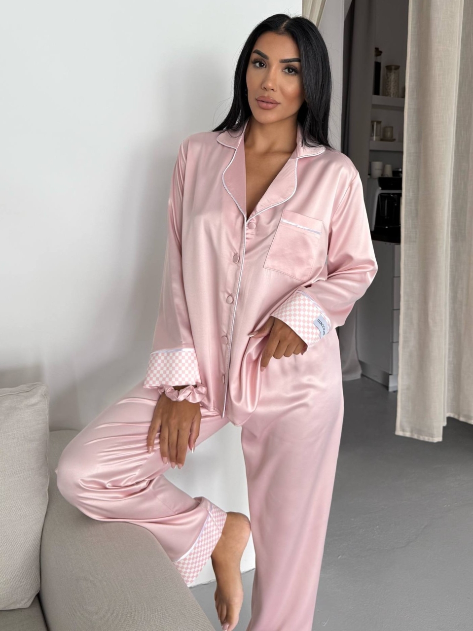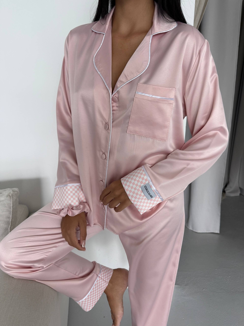 Pijama damă din două piese , realizată din poliester de calitate, cu aspect de satin mat , ideală pentru confort și libertate de mișcare. Materialul are o textură fină, plăcută la atingere, oferind un look elegant și modern, perfect atât pentru somn, cât și pentru momentele de relaxare acasă. Setul este compus din bluză cu închidere frontală cu nasturi , guler clasic și buzunar aplicat, completată de pantaloni lungi cu croi lejer si elastic pentru par. Datorită proprietăților stretch, pijamaua se așază armonios pe corp, fără a crea disconfort. Deoarece are o croială lejeră, comandă mărimea exactă. Designul simplu, este ușor de integrat în garderoba de casă și potrivit pentru toate sezoanele. Detalii produs: Tip produs: Pijama damă Set: 2 piese + elastic pentru par Închidere: Nasturi Material: 95% Poliester, 5% Elastan Aspect material: Satin mat, stretch Croi: Lejer Lungime pantaloni: Lungă Modelul poartă mărimea S Dimensiunile modelului: Înălțime: 164 cm, Greutate: 50 kg Instrucțiuni de întreținere: Spălare la maximum 30°C Program delicat / rufe sintetice Nu se înălbește Nu se usucă în uscător Țara de origine: Turcia Important : Culoarea produsului poate varia ușor datorită luminozității monitorului. Din cauza varietății instrumentelor de măsură, pot exista ușoare erori de cm, informațiile de mai sus sunt aproximative.