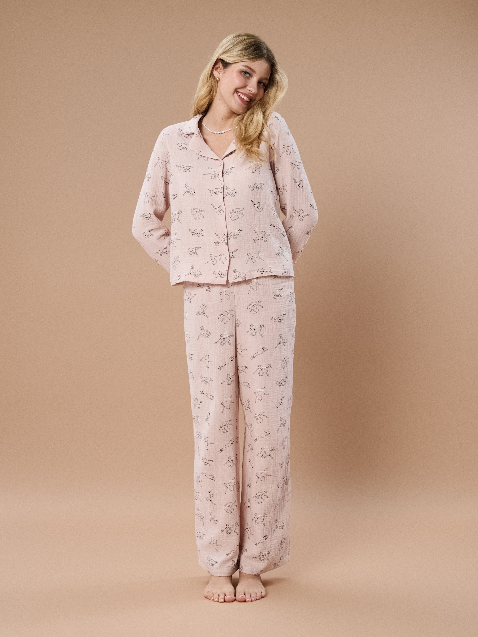 Sinsay - Pijama din muselină cu guler și imprimeu cu căței - roz-pastel -